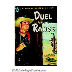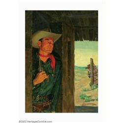 George Gross - Original Digest Cover Art (1951). George Gross was an exceptionally skillful and prolific artist. His cover art for the detective and adventure pulp and digest magazines have gained him considerable notoriety and admiration. He also did extensive work in paperbacks, painting memorable covers for such publishers as Dell, Bantam, and Ace. He did considerable work in westerns, and this digest cover is a superb example of his distinctive style and his work in the genre. It was published as Star Books #19 - Duel on the Range, by Burt Arthur. Painted in oil on canvas, and framed (23 x 18) with an approximate sight size of 16 x 11.5, it is signed lower right. An issue of the digest is included. Important notice: We expect to be auctioning lots at the rate of 200-250 per hour. Sometimes eBay Premier live bid software cannot keep up with that pace, so we strongly recommend that you place a realistic proxy bid now as insurance to avoid disappointment. Also please note that all Heritage/CAA lots purchased through eBay Premier carry a 20% Buyer's Premium. Please make sure you read the Terms and Conditions.