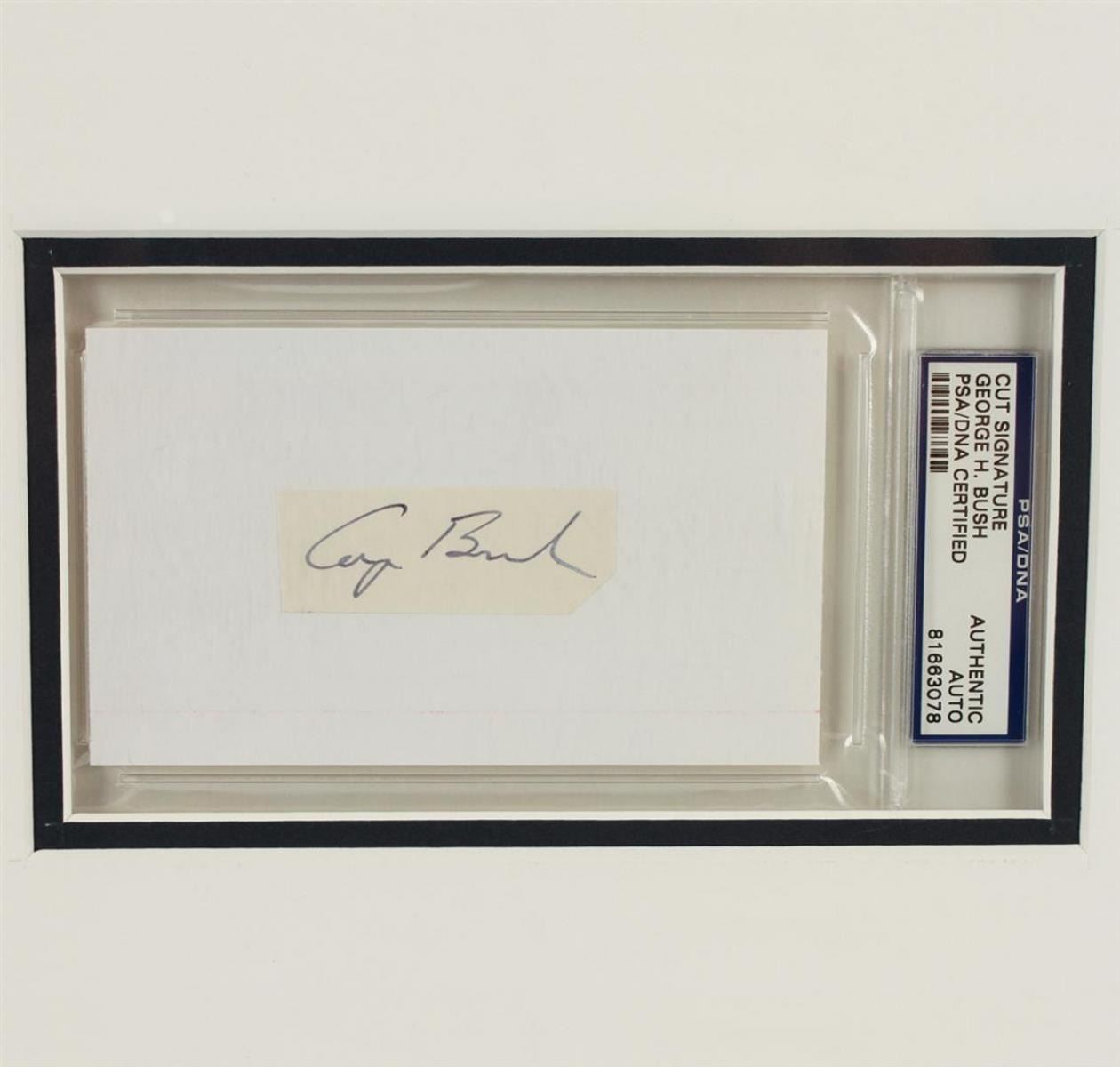 A one of a kind display featuring the autograph of President George H. Bush showcased in a beautiful custom matted display that features a photo of President Bush. The signature is authenticated and encapsulated by PSA. George Herbert Walker Bush (born June 12, 1924) is an American politician who served as the 41st President of the United States from 1989 to 1993, and the 43rd Vice President of the United States (1981 - 1989). This piece comes framed and ready to hang! Dimensions: 15.5" x 27". PSA Certified.