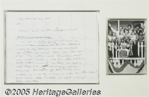 <B>George H. Bush on the Power of Prayer</B></I> Autograph manuscript (unsigned) as Vice President, 11" x 8.5", written on the verso of a desk calendar bearing Mr. Bush's schedule for June, 1983 -- a draft for public remarks concerning the power of prayer. He writes in full (with some corrections): "prayer can comfort & give strength words crossed out We had a child very ill with cancer. In our ward most of the kids wouldn't make it. My Barbara adored the parents of a sick little guy named Joe how Joe was doing. the mother said 'Remember what the Lord said - Let the little children that suffer come to me. Well Joe had a bad day but our prayers will be answered. It matters not that the words were mixed up (Let the children vs suffer the children what counts was her faith and belief in prayer" Very bright and clean and in excellent condition. Tastefully matted with a photo of the entire Bush family. <I>Accompanied by COA from PSA/DNA.</B></I>