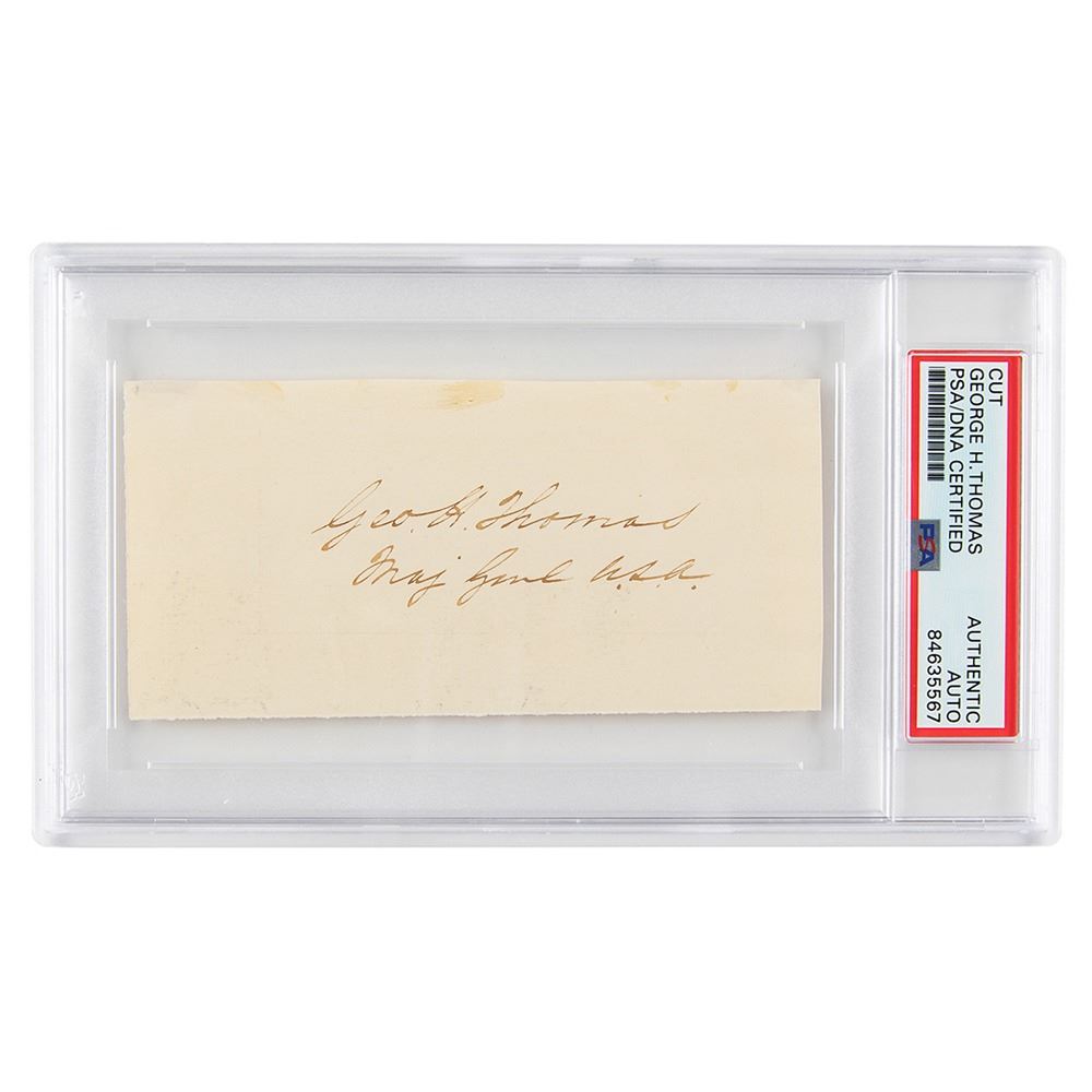 Ink signature, "Geo. H. Thomas, Maj. Genl. U.S.A.,†on an off-white 4.75 x 2.25 sheet. In fine condition, with a small stain to the top edge. Encapsulated in a PSA/DNA authentication holder.