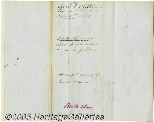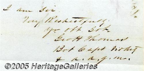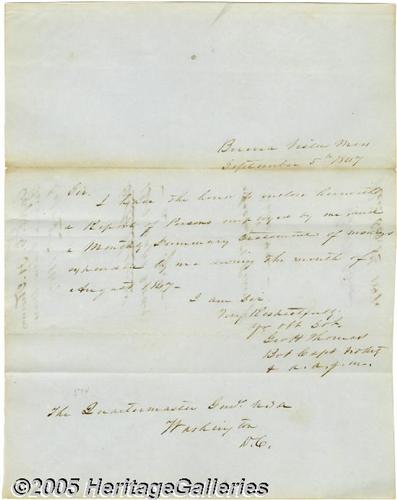 <B>George H. Thomas, The Rock of Chickamauga.</B></I> Autograph Letter Signed "Geo H. Thomas", 7.75" x 10", Buena Vista, Mexico, September 5, 1847. While serving in the Mexican War, the future Union general writes the Quartermaster General in Washington noting the enclosure of "...a Report of Persons employed by me, and a Monthly summary statement of moneys expended by me during he month of August 1847..." Moderate toning along horizontal folds but in otherwise bright and clean. <I>From the collection of Bradley O'Leary.</B></I> <I>Accompanied by COA from PSA/DNA.</B></I>