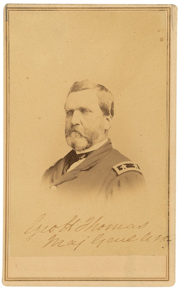 Union general (1816–1870) whose most decisive victory earned him the sobriquet ‘Rock of Chickamauga.’ Original 2.5 x 4 carte-de-visite bust portrait of Thomas in uniform, by A. S. Morse of Nashville, signed at the bottom of the image in black ink, “Geo. H. Thomas, Maj. Genl USA.” In fine condition, with some light surface spots and marks, trivial silvering to dark areas of the image, and the signature a shade light.