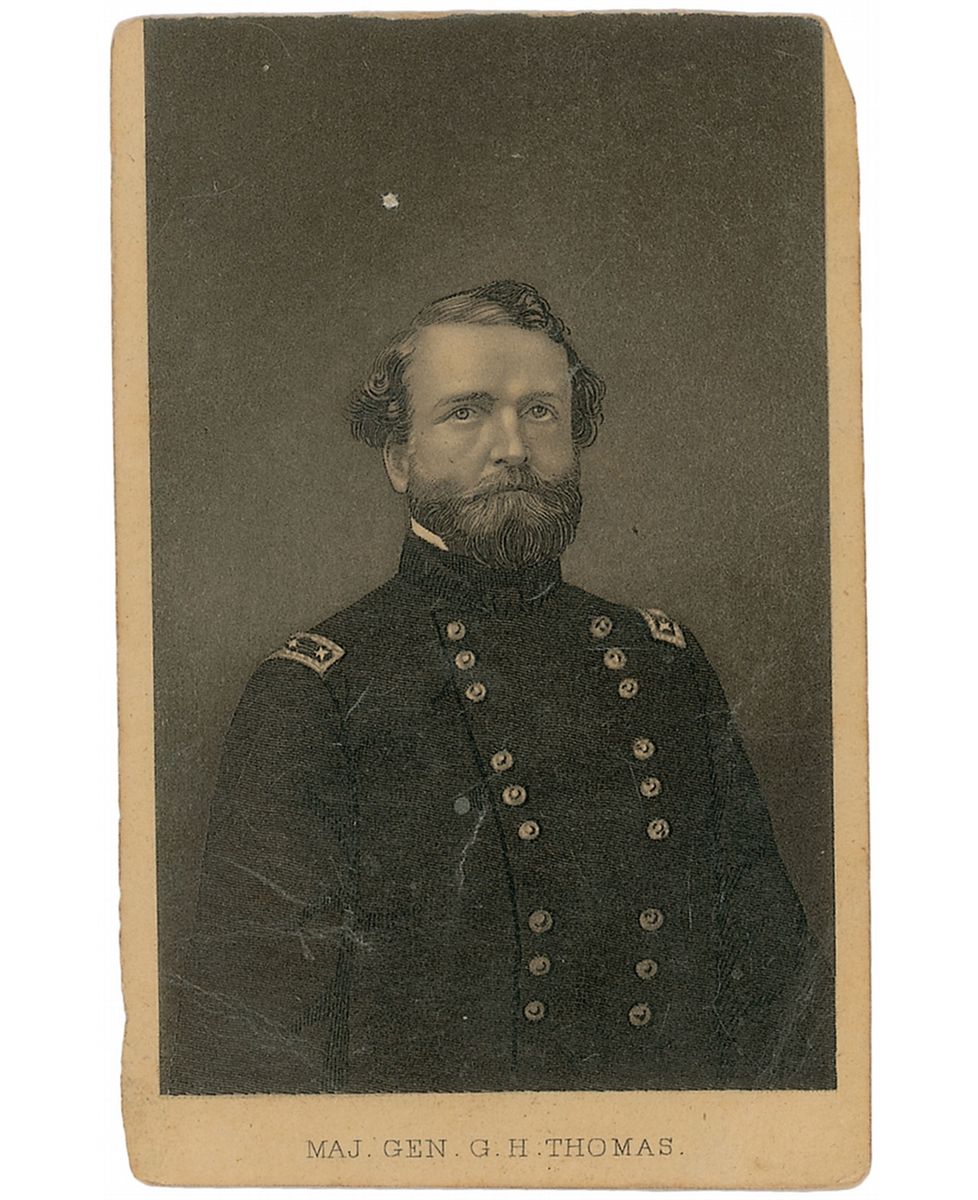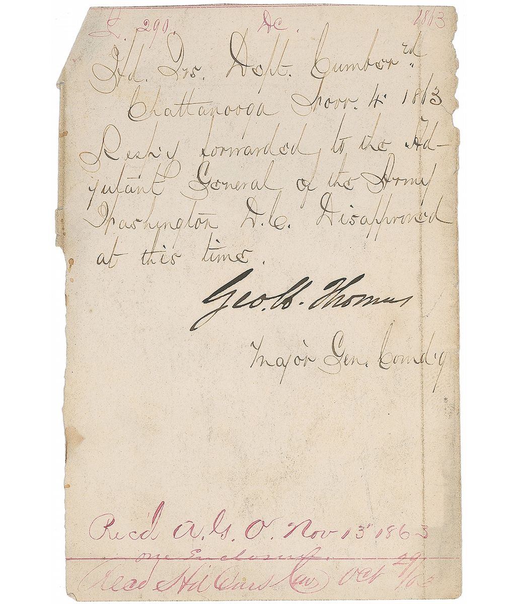 Union general (1816–1870) whose most decisive victory earned him the sobriquet ‘Rock of Chickamauga.’ War-dated manuscript DS, signed “Geo. H. Thomas,” one page, 3.5 x 5.25, November 4, 1863. Document issued from the headquarters of the Department of the Cumberland at Chattanooga. In full: “Resp’y forwarded to the Adjutant General of the Army Washington D.C. Disapproved at this time.” A vertical fold to the right edge, chipping to edges, and light soiling, otherwise fine condition. Accompanied by an unsigned CDV-style portrait.