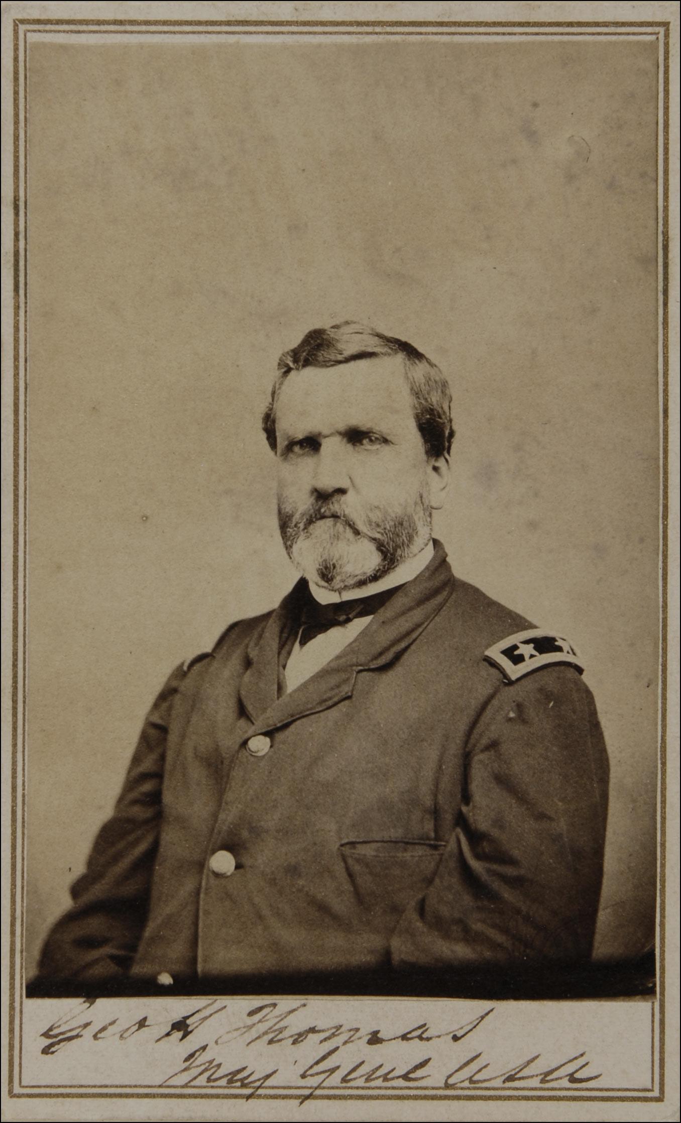 Union general (1816–1870) whose most decisive victory earned him the sobriquet "Rock of Chickamauga.” Original vintage 2.5 x 4 carte-de-visite photo, originally taken by A. B. Morse, signed in the lower border in black ink, “Geo. H. Thomas, Maj. Genl USA.” Matted and framed to an overall size of 9 x 10.25. A bit of scattered light silvering along bottom, and some scattered light foxing, primarily to background, otherwise fine condition. Pre-certified PSA/DNA and RRAuction COA.