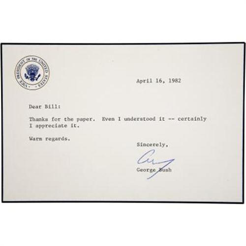 <B>George H. W. Bush Typed Note Signed as Vice President</B></I> 6.25” x 5”, on vice presidential note card, April 16, 1982, n.p.. Fine.<BR><BR><BR><BR><b>Shipping:</b> Miscellaneous Collectibles, Smal (<a target="_blank" href="http://www.heritageauctions.com/common/shipping.php">view shipping information</a>)