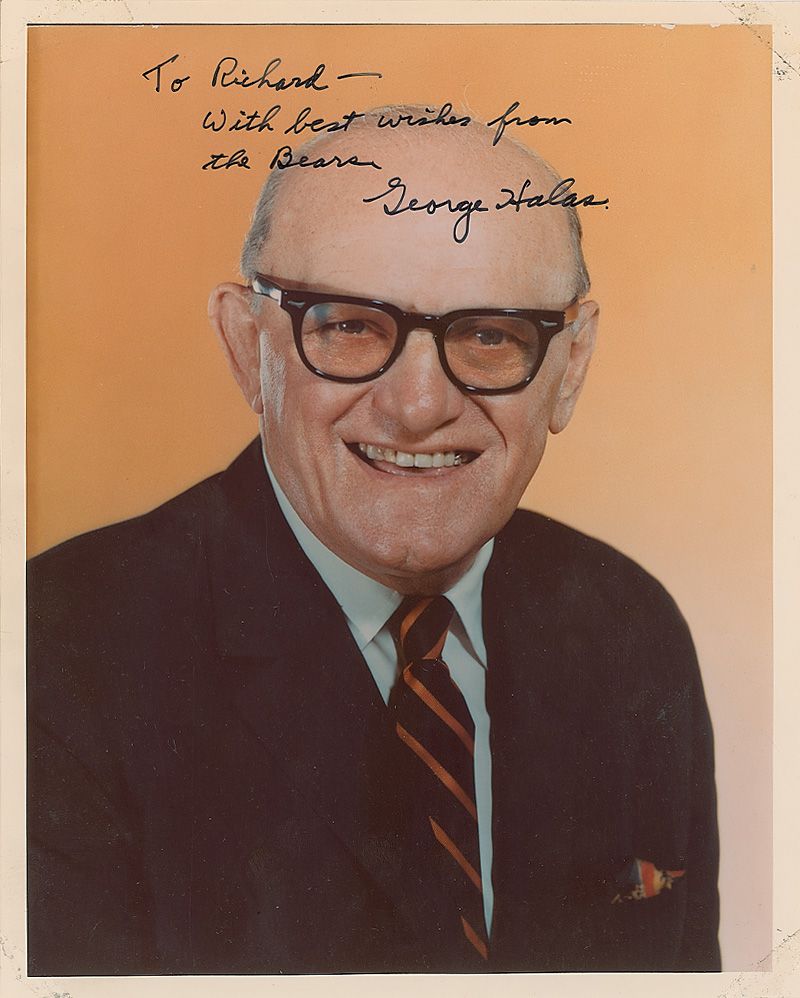 Football Hall of Famer (1895–1983) who was associated with the Chicago Bears and the National Football League from their inception in 1920 until his death. Color satin-finish 8 x 10 photo, signed and inscribed in black felt tip “To Richard—With best wishes from the Bears, George Halas.” Adhesive remnants to each corner and a few light bends and creases, otherwise fine condition.