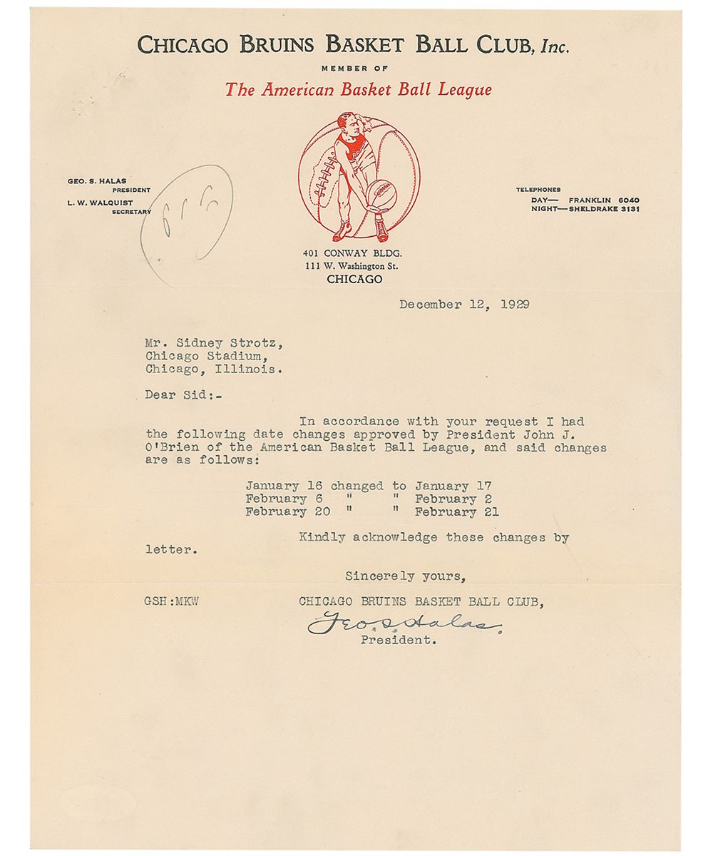 TLS signed “Geo. S. Halas,” one page, 8.5 x 11, Chicago Bruins Basket Ball Club, Inc. illustrated letterhead, December 12, 1929. Letter to Sidney Strotz, who helped manage the Chicago Stadium. In part: “In accordance with your request, I had the following changes approved by President John J. O’Brien of the American Basket Ball League,” and goes on to list three date changes. Scattered creases, staple holes to the upper left corner, an office notation in pencil to the upper left, and some show-through from a JSA authentication label affixed to reverse, otherwise fine condition. While Halas is typically associated with the Chicago Bears, he was also the owner of the Bruins, a basketball team born in 1925 with the creation of the ABL—the first attempt to form a professional basketball league. An incredible piece of Chicago sports history.