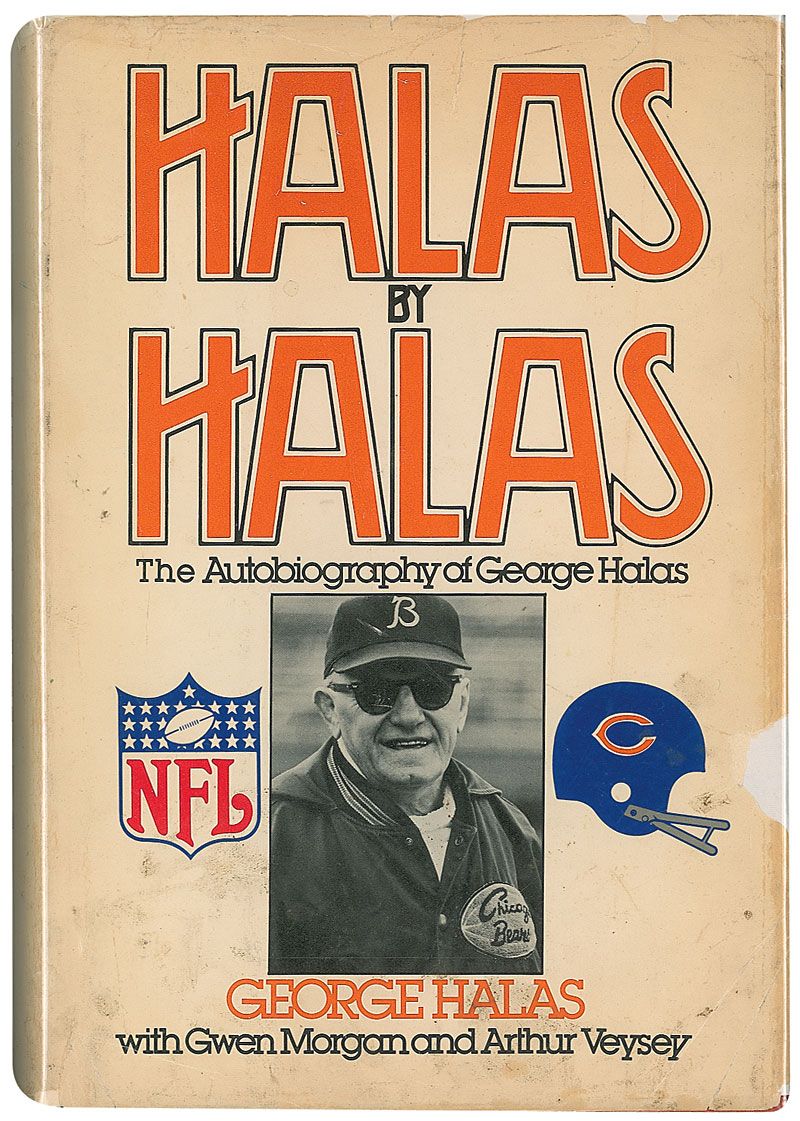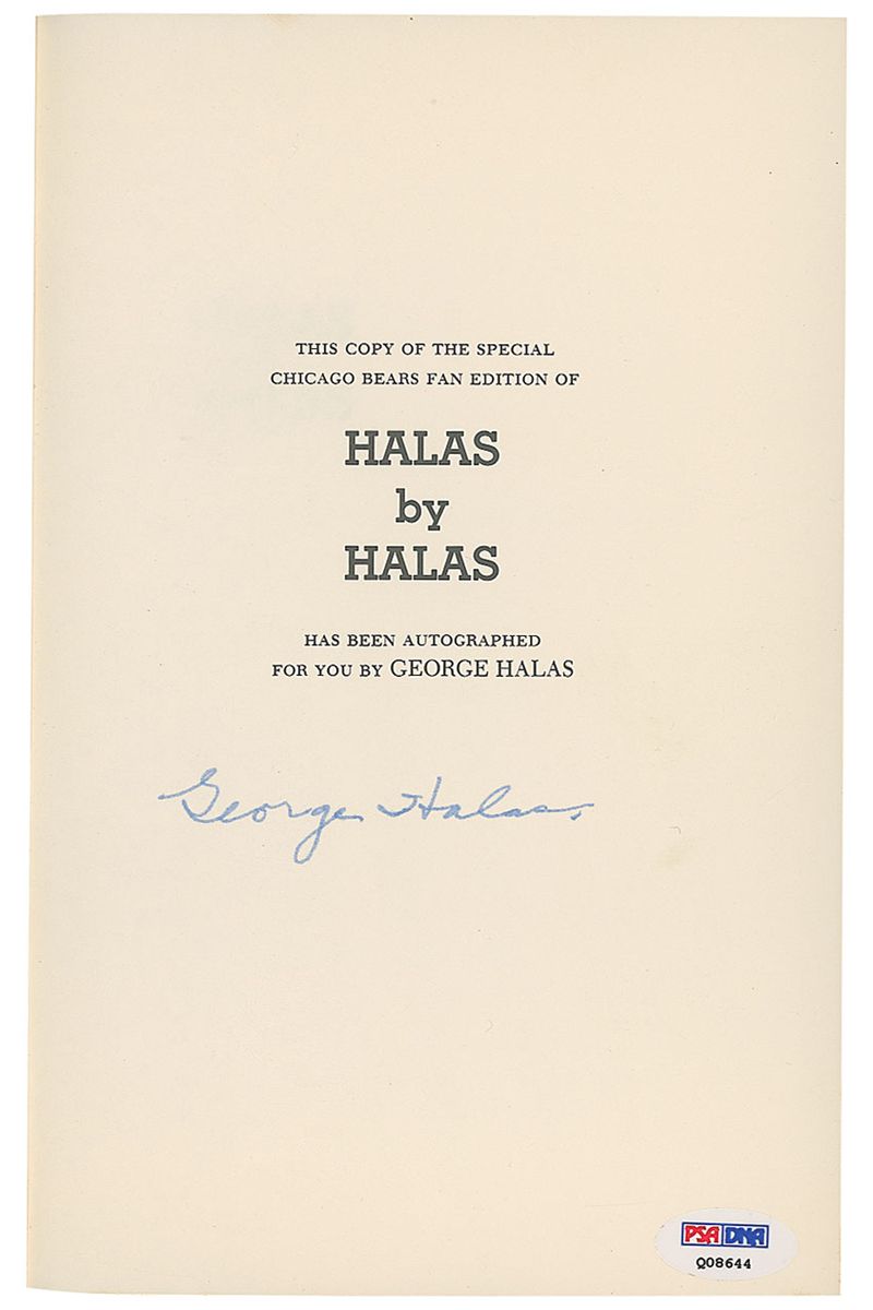 Signed book: Halas by Halas. Chicago Bear Fan edition. NY: McGraw-Hill, 1979. Hardcover with dust jacket, 6.5 x 9.25, 351 pages. Signed on the colophon in blue ink. Some soiling and owner’s label to front pastedown and first free end page, pencil notation to first free end page, toning, soiling and scattered paper loss to clipped dust jacket, a PSA/DNA authentication label affixed to signed page, otherwise fine condition. Accompanied by a full letter of authenticity from PSA/DNA.