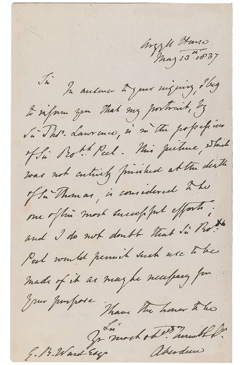 Scottish politician (1784–1860) who served as Prime Minister of the United Kingdom from 1852 until 1855. ALS signed “Aberdeen,” 4.5 x 7, May 13, 1837. Letter to G. R. Ward regarding a portrait by Sir Thomas Lawrence. In part: “I beg to inform you that my portrait, by Sir Thos. Lawrence, is in the possession of Sir Robt. Peel. This picture, which was not entirely finished at the death of Sir Thomas, is considered to be one of his most successful efforts, and I do not doubt that Sir Robt. Peel would permit such use to be made of it as may be necessary for your purpose.” In fine condition, with a few mild creases and a light shade of toning.