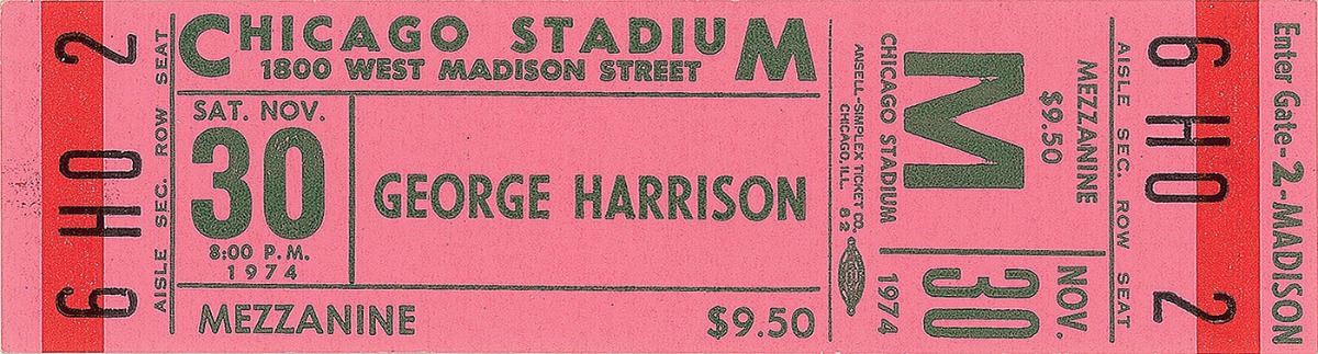 Unused ticket for a George Harrison solo show at Chicago Stadium on November 30, 1974, for admission to the mezzanine. The ticket, measuring 5.25 x 1.5, features black print on pink cardstock. In fine condition. Although audiences received Harrison well during his 1974 North American tour, he received sharp criticism for some of his new India–inspired music, and it proved an important stepping stone in his musical development.