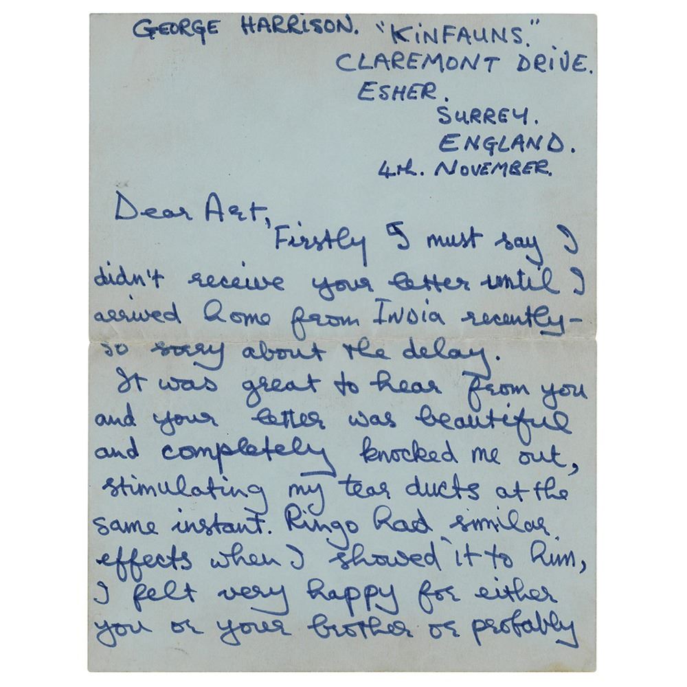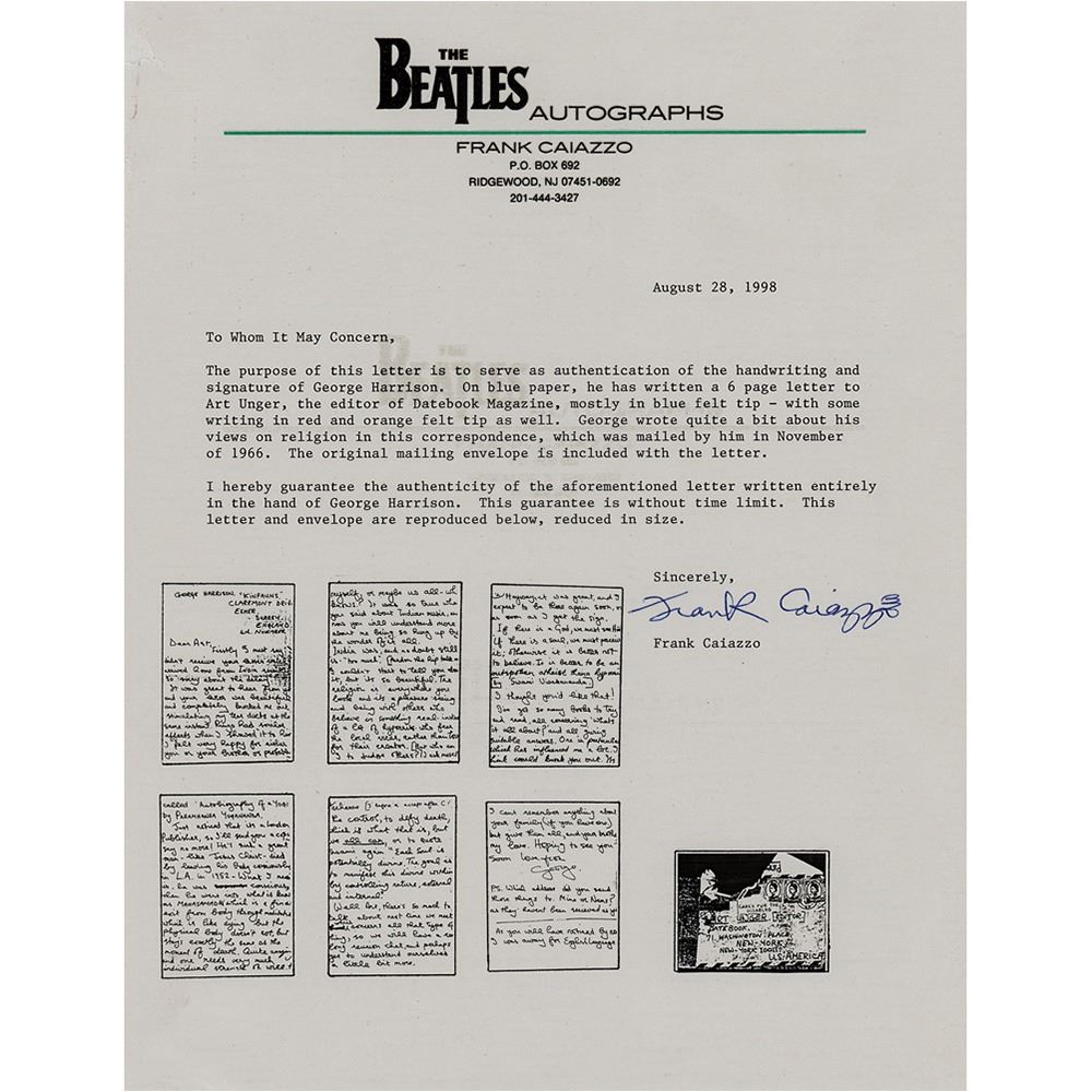 Extraordinary twice-signed ALS signed “Love from, George†and “George Harrison,†six pages, 5.5 x 7, November 4, 1966. Handwritten letter addressed from Harrison’s “Kinfauns†home in Esher, England, sent to his close friend, Art Unger, the owner and editor of the U.S.-based magazine Datebook, shortly after Harrison and his wife, Pattie Boyd, had returned from their historic trip to India. Although the letter is written primarily in blue felt tip, Harrison has also used orange and red felt tip for key points of emphasis, with much of the letter centering around the impact of India on Harrison’s belief system and his musical taste. The letter, in full: “Firstly I must say I didn’t receive your letter until I arrived home from India recently—so sorry about the delay.