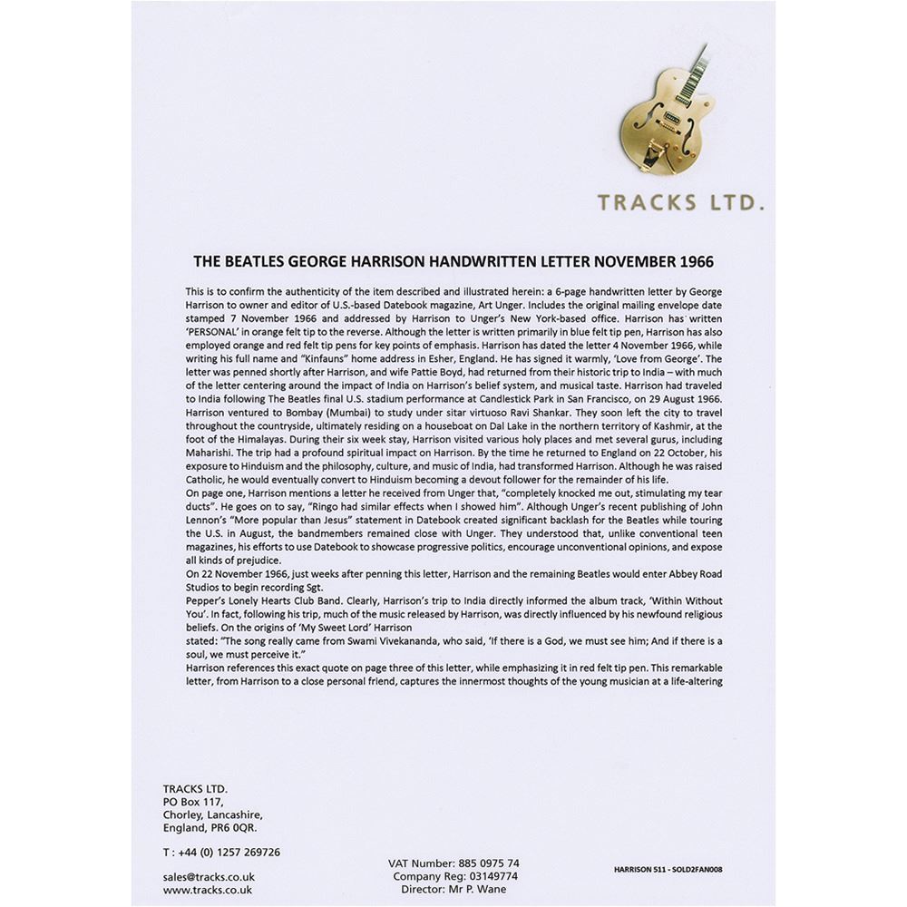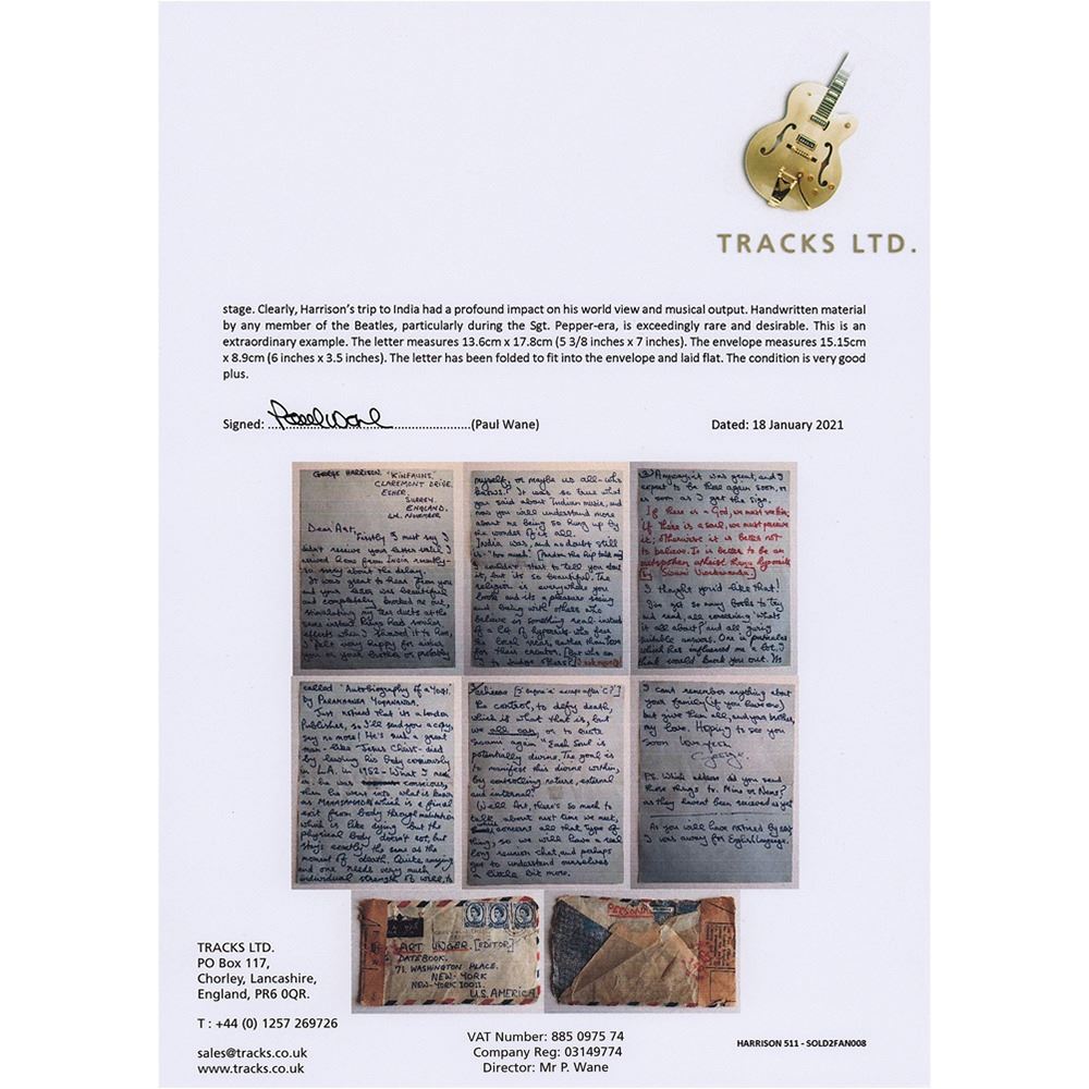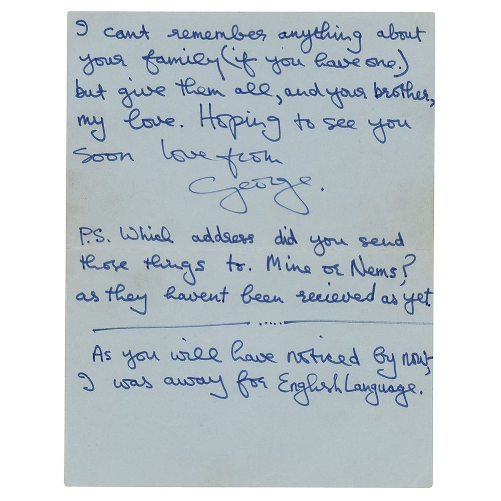 Well Art, there’s so much to talk about next time we meet, which concerns all that type of thing, so we will have a real long reunion chat, and perhaps get to understand ourselves a little bit more. I can’t remember anything about your family (if you have one), but give them all, and your brother, my love. Hoping to see you soon.†Harrison adds a postscript: “P.S. Which address did you send those things to. Mine or Nems? As they haven’t been received yet? As you will have noticed by now, I was away for English Language.†The second autograph is incorporated in the address Harrison has added to the top of the first page. In fine condition, with a small tape stain to each page. Accompanied by the original mailing envelope addressed by Harrison, who adds “Personal†on the reverse flap, and by letters of authenticity from Tracks and noted Beatles expert Frank Caiazzo.