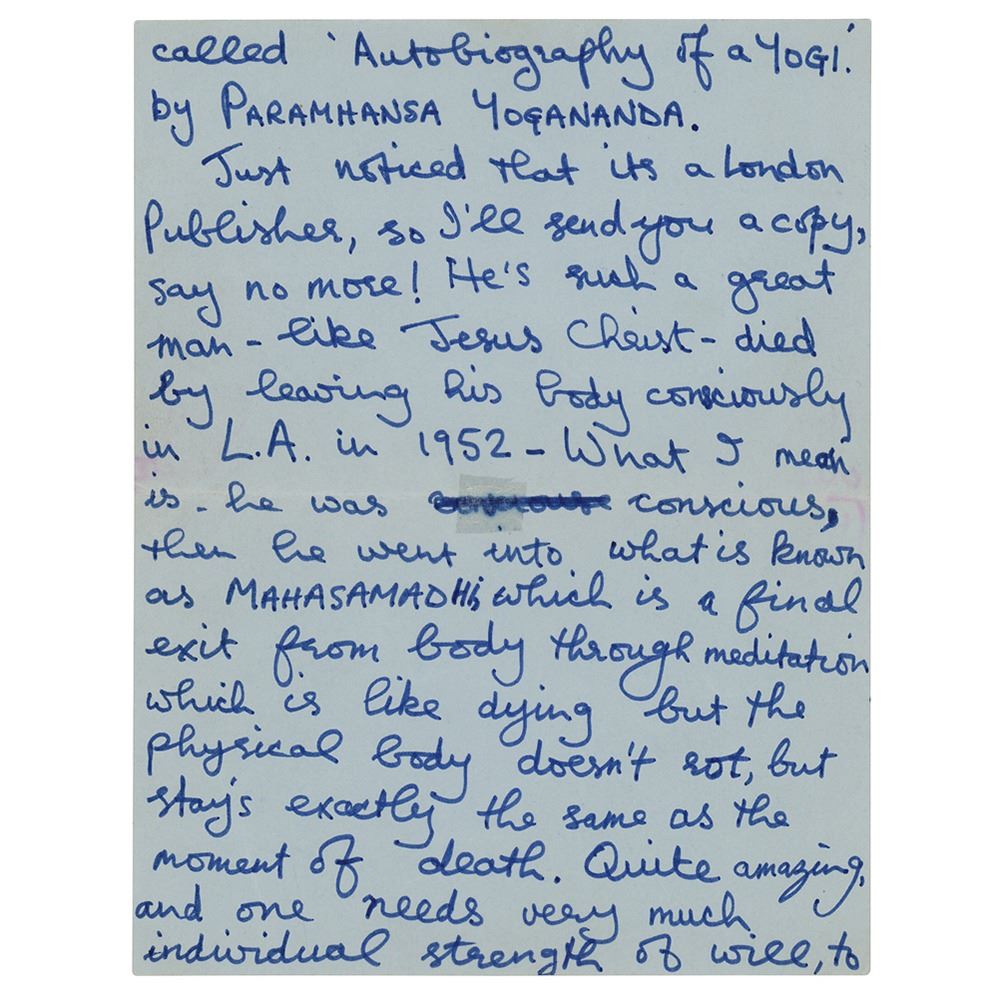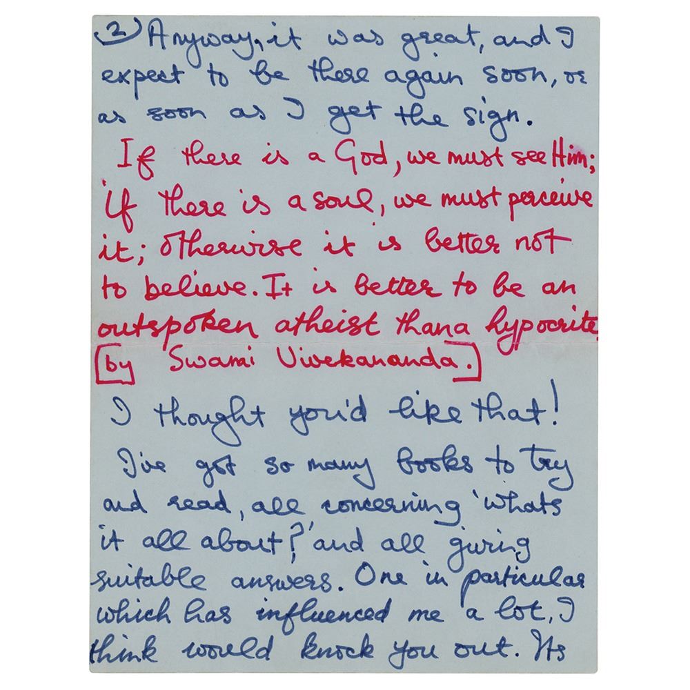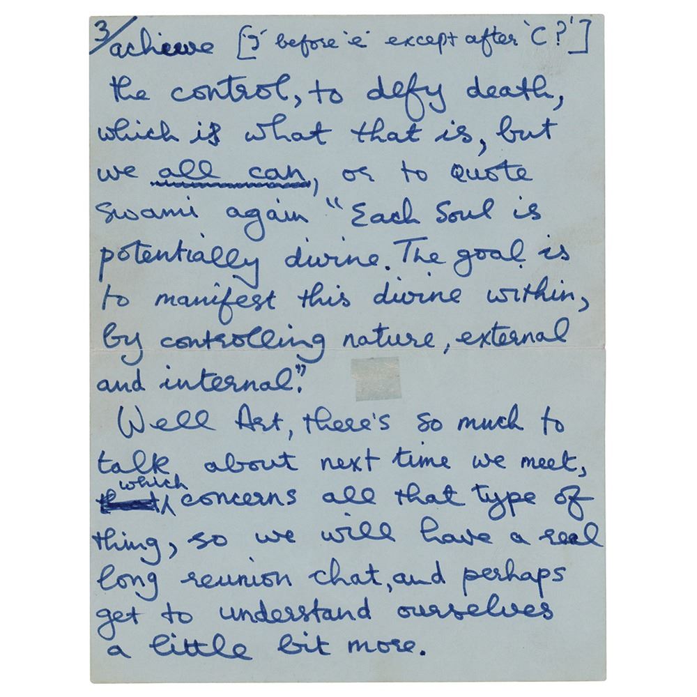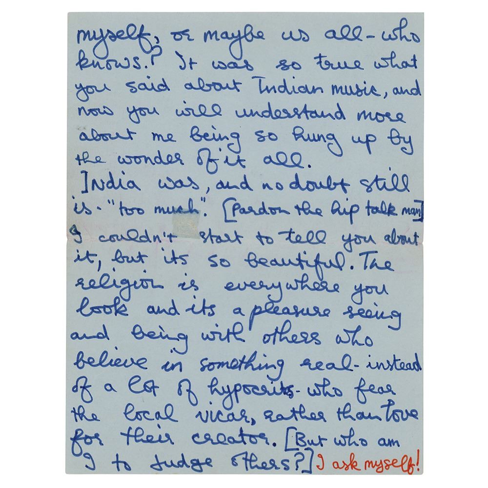 On November 22, 1966, just weeks after writing this letter, Harrison and the remaining Beatles entered Abbey Road Studios to begin recording Sgt. Pepper’s Lonely Hearts Club Band. Following Harrison’s trip to India, much of the music he released was influenced by his newfound religious beliefs, in particular the album track ‘Within You Without You,’ his sole composition on Sgt. Pepper. On the origins of ‘My Sweet Lord’ Harrison stated: ‘The song really came from Swami Vivekananda, who said, ‘If there is a God, we must see him; And if there is a soul, we must perceive it.’ Harrison references this exact quote on page three of this letter while emphasizing it in red felt tip. This remarkable letter, from Harrison to a close personal friend, captures the innermost thoughts of the young musician at a life-altering stage. Handwritten material by any member of the Beatles, particularly during the Sgt. Pepper-era, is exceedingly rare and desirable—an extraordinary letter from the late Beatles guitarist.