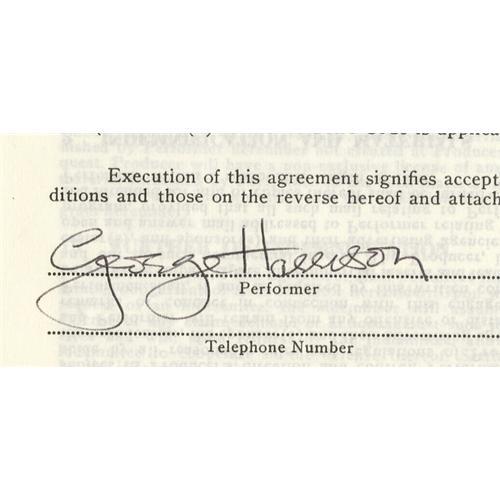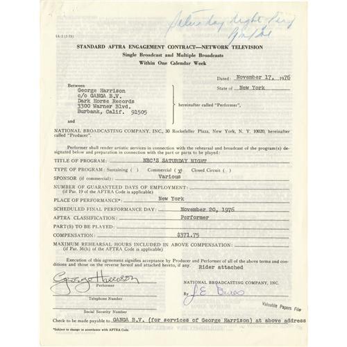 <B>George Harrison Signed "Saturday Night Live" Contract.</B></I> A standard AFTRA television contract dated November 17, 1976, engaging the former Beatle as a musical guest for the November 20 episode, signed by Harrison in black ink. Producer Lorne Michaels had offered the Beatles $3,000 to appear on the show in a bid to get them to re-unite. In a 1980 <I>Playboy</B></I> magazine interview, John Lennon stated that he and Paul McCartney were at his New York City apartment watching the show the night Michaels made the on-air announcement, and that they considered taking a taxi to the studio and performing, but were too tired. Harrison was the only one who took him up on the offer, and the performance was later rebroadcast on the show as a tribute following Harrison's death in 2001. The contract is in Excellent condition with minor wear and some staple holes to the upper left corner.<I>Accompanied by LOA from PSA/DNA.</B></I><BR><BR><b>Shipping:</b> Flat Material, Small (<a target="_blank" href="http://www.heritageauctions.com/common/shipping.php">view shipping information</a>)