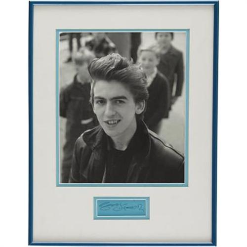 <B>George Harrison Framed Autograph.</B></I> A blue autograph album page signed by the late Beatles guitarist in blue ballpoint. In Excellent condition, matted and framed along with a b&w 8" x 10" photo of a very young Harrison to an overall size of 14" X 18.5". In Excellent condition. <I>Accompanied by a COA from Frank Caiazzo.</B></I><BR><BR><b>Shipping:</b> Framed - with Glass, Medium (<a target="_blank" href="http://www.heritageauctions.com/common/shipping.php">view shipping information</a>)