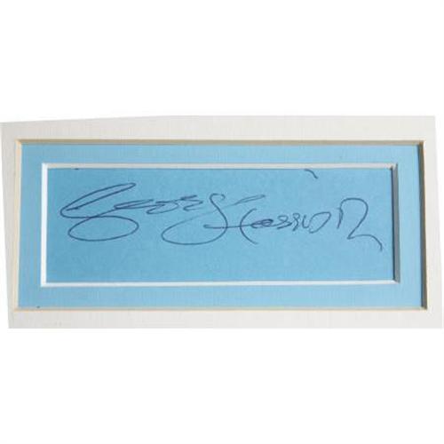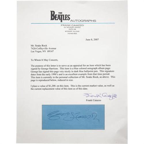 <B>George Harrison Framed Autograph.</B></I> A blue autograph album page signed in the early '90s by the late Beatles guitarist in blue ballpoint. In Excellent condition, matted and framed along with a b&w 8" x 10" photo of a very young Harrison to an overall size of 14" x 18.5". In Excellent condition. <I>Accompanied by certificates of aucthenticity from Beatles autograph expert Frank Caiazzo and PSA/DNA.</B></I><BR><BR><b>Shipping:</b> Framed - with Glass, Medium (<a target="_blank" href="http://www.heritageauctions.com/common/shipping.php">view shipping information</a>)