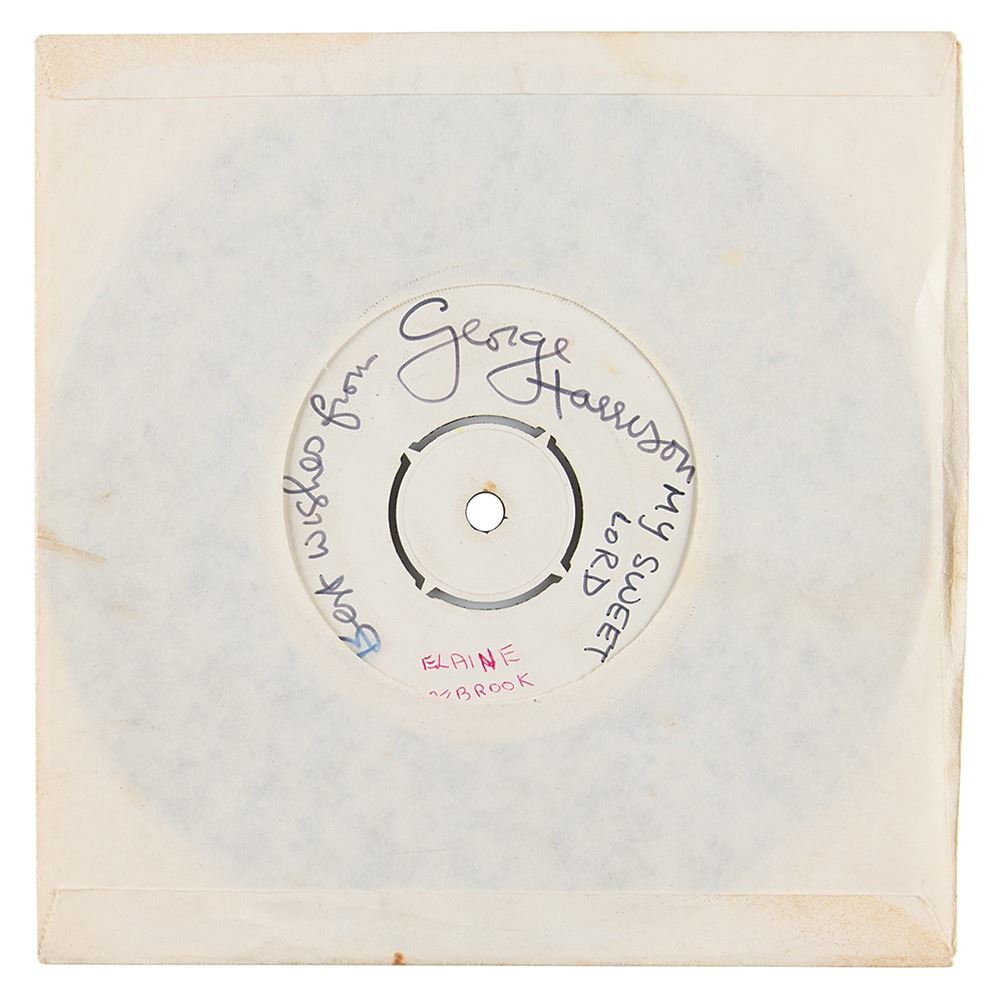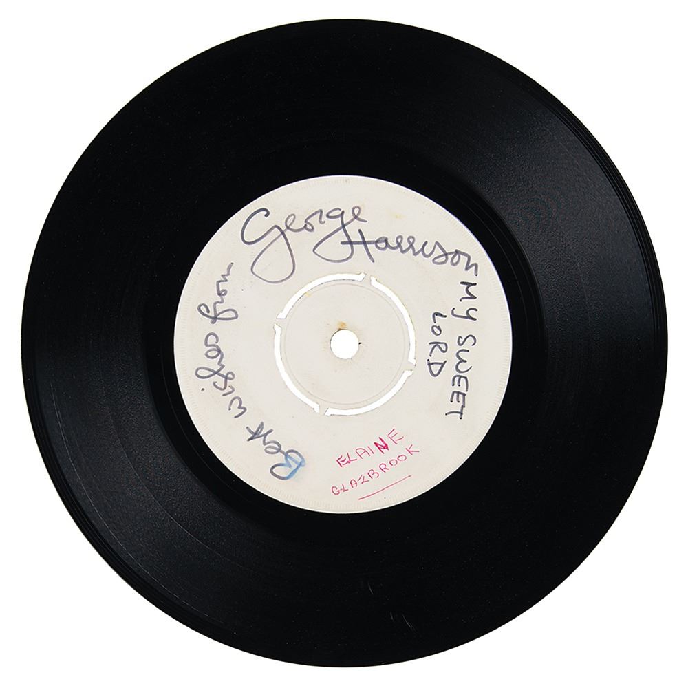 Exceedingly rare EMI/Apple Records 7-inch ‘white label’ test pressing of the 1971 single ‘My Sweet Lord / What is Life’ by George Harrison, who has signed the ‘A side’ label in black felt tip, “Best wishes from, George Harrison,” and annotated the song titles on either side, “My Sweet Lord” and “What is Life.” The consignor notes that this test pressing was Harrison’s personally owned copy and was given by Harrison to a mechanic at his Friar Park estate, Henley-on-Thames, in March 1971, as a ‘thank you’ gift for repairing his famous psychedelic Mini, an Austin Cooper 'S,’ LGF 695D, which was featured in the 1967 film Magical Mystery Tour. The 'A Side' label bears an ownership notation. In fine condition, with a trivial smudge to the first letter of the sentiment. Test pressings formerly belonging to any member of the Beatles are exceedingly scarce. Few examples have ever surfaced, and signed examples, such as this, are virtually nonexistent. This early and important example of, arguably, George Harrison’s most iconic song as a solo artist, signed and gifted by Harrison under such personal circumstances, makes this truly unique.