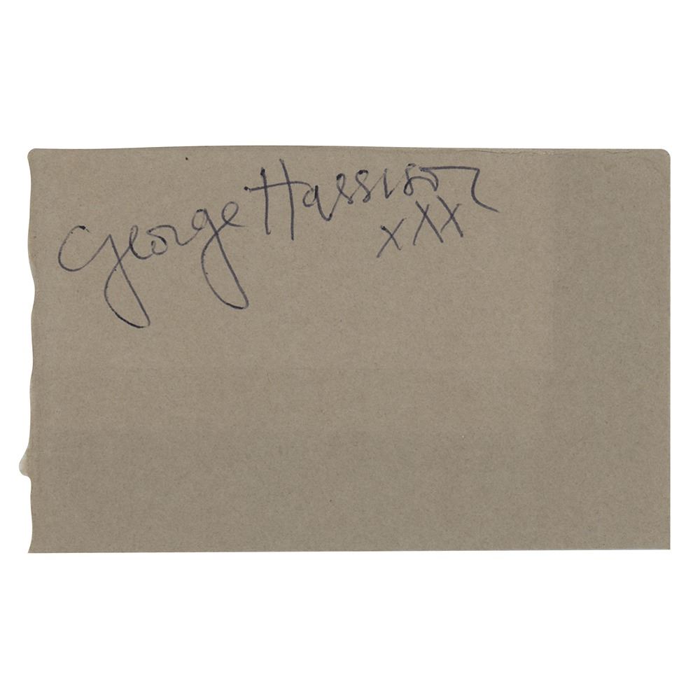 Ballpoint signature, "George Harrison, xxx,” on a beige 4 x 2.5 sheet. In fine condition, with faint toning from prior display.
