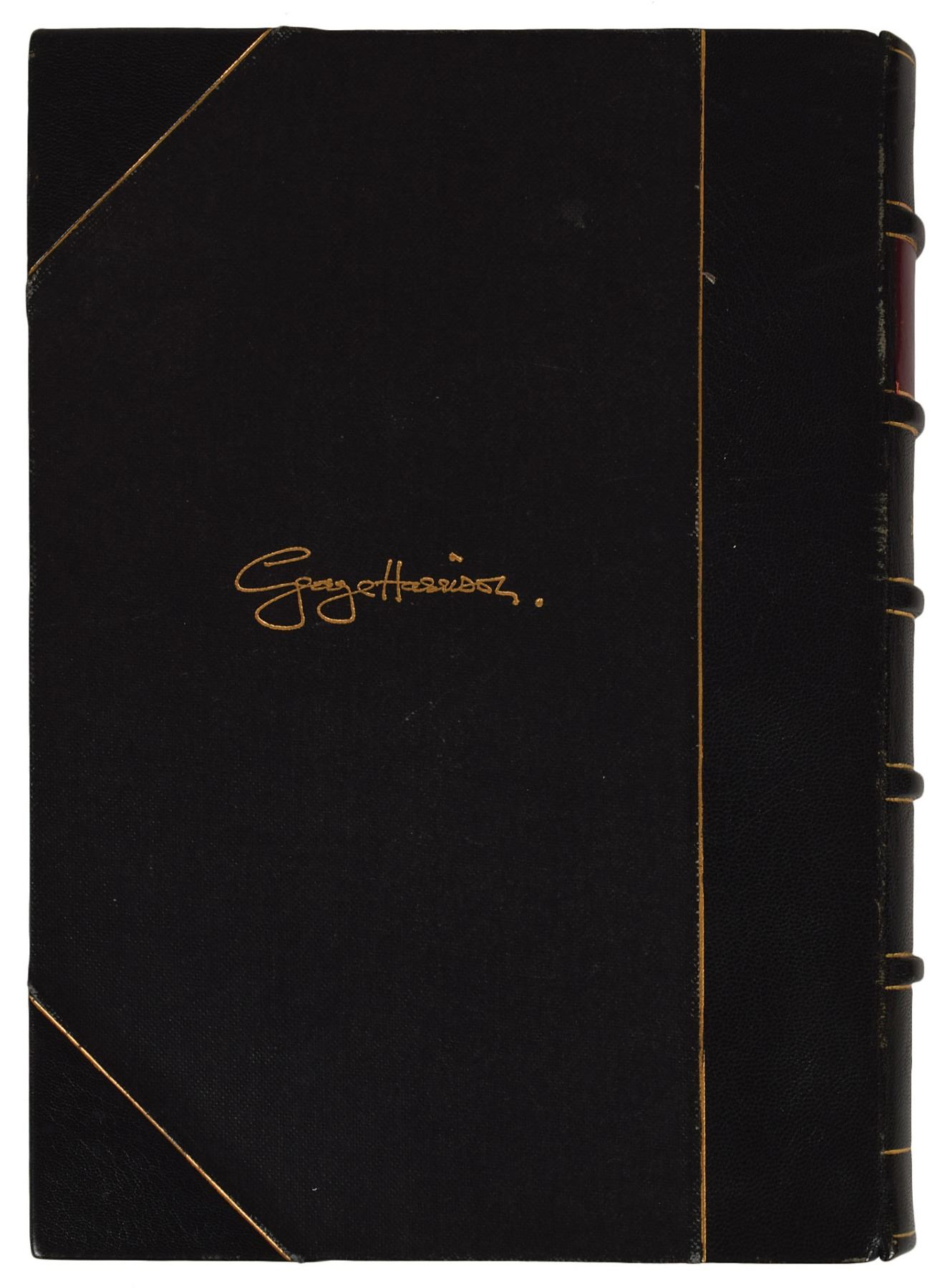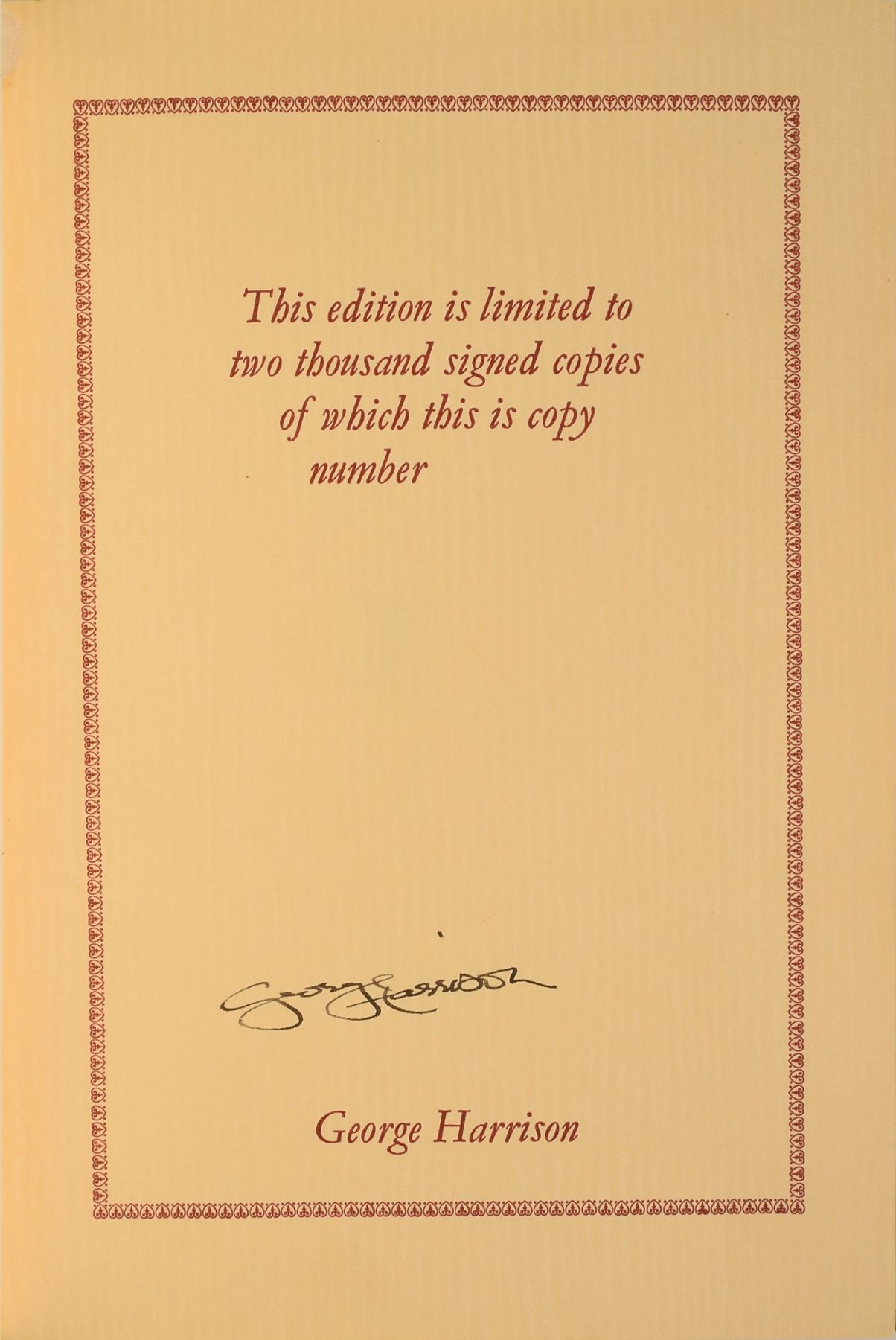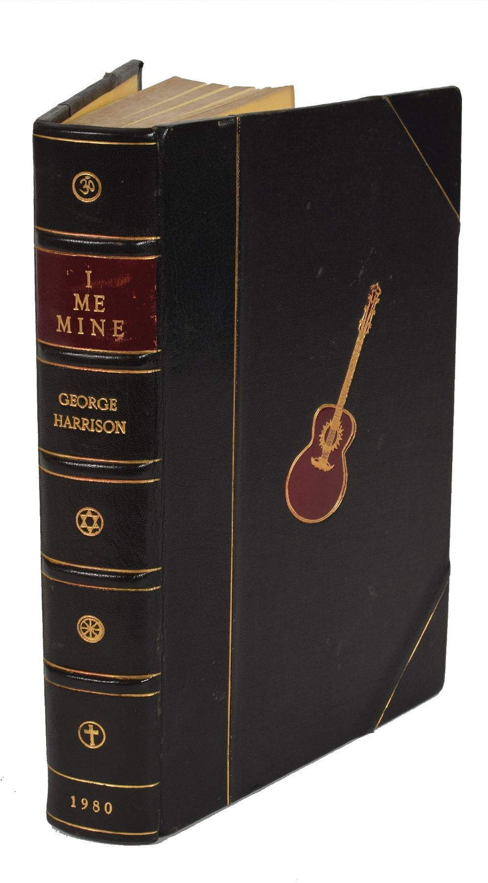 Signed book: I, Me, Mine. First edition, limited issue of 2000 but unnumbered. England: Genesis Publications, 1980. Hardcover, 7 x 9.75, 398 pages. Signed on the colophon in black ink by Harrison. In fine condition, with a small paper remnant to upper left corner of signed page; slight toning to opening and closing pages, some wear and scattered scuffs to covers, spine, and textblock. An extremely desirable autobiographic work by George Harrison, this hand-bound, limited edition book by Genesis Publications sold out soon after its release and remains quite difficult to find today. Its mixture of printed text and multicolor facsimiles of Harrison's handwritten lyrics make it a beautiful edition to behold. This is one of just three unique unnumbered copies of the book, two of which were issued to Harrison and Bryan Roylance, the owner of Genesis Publications.