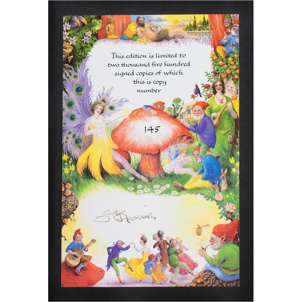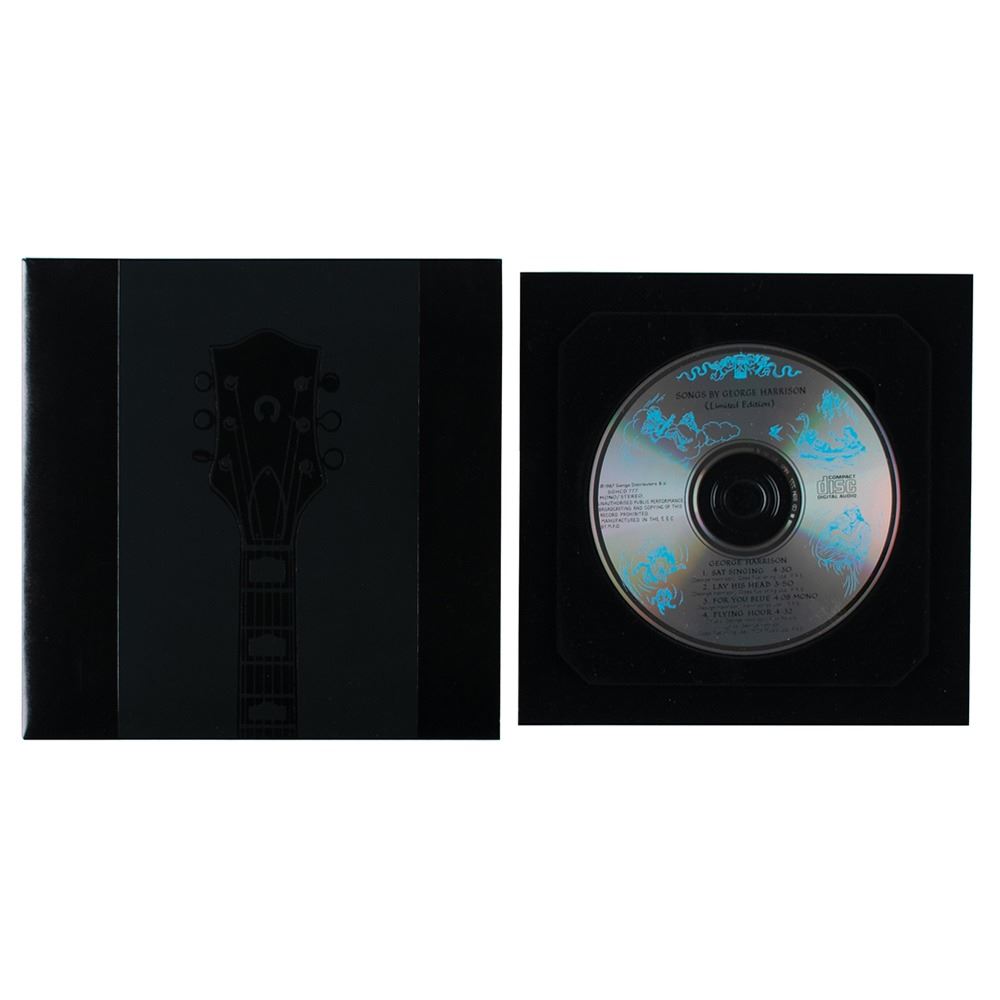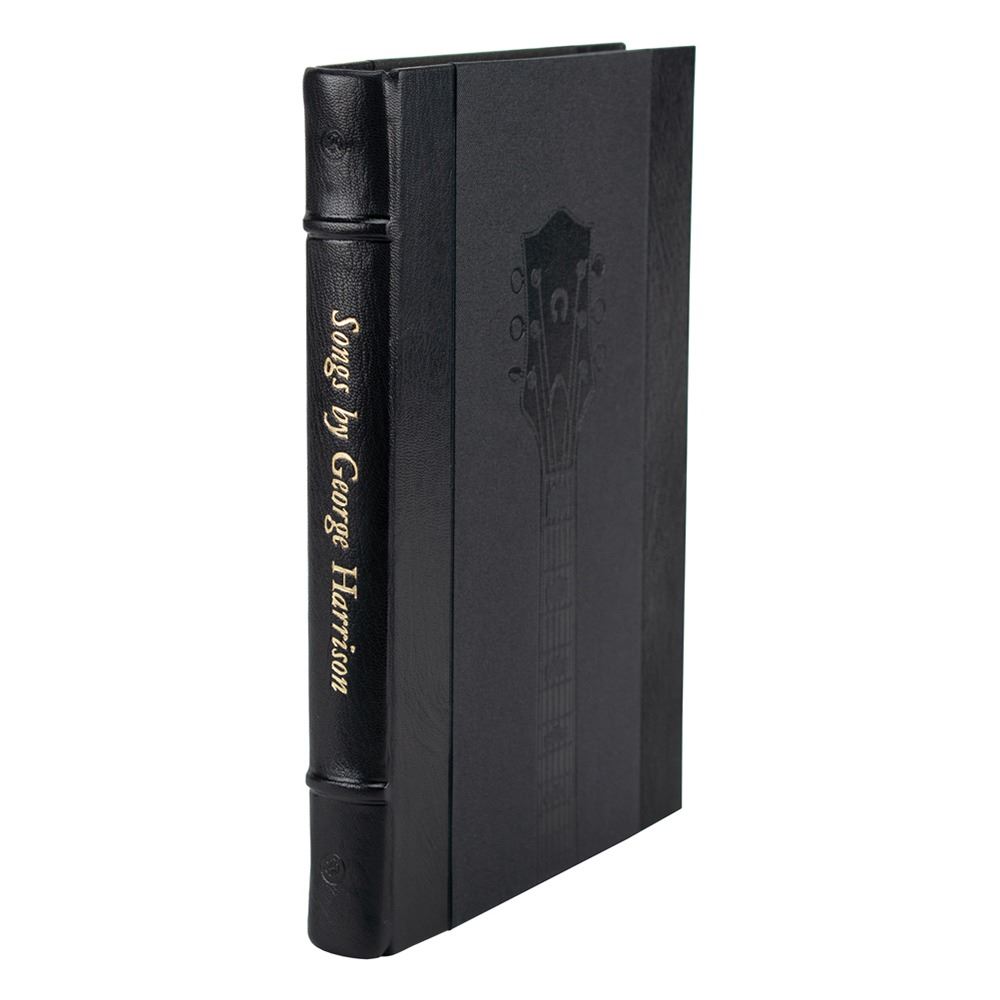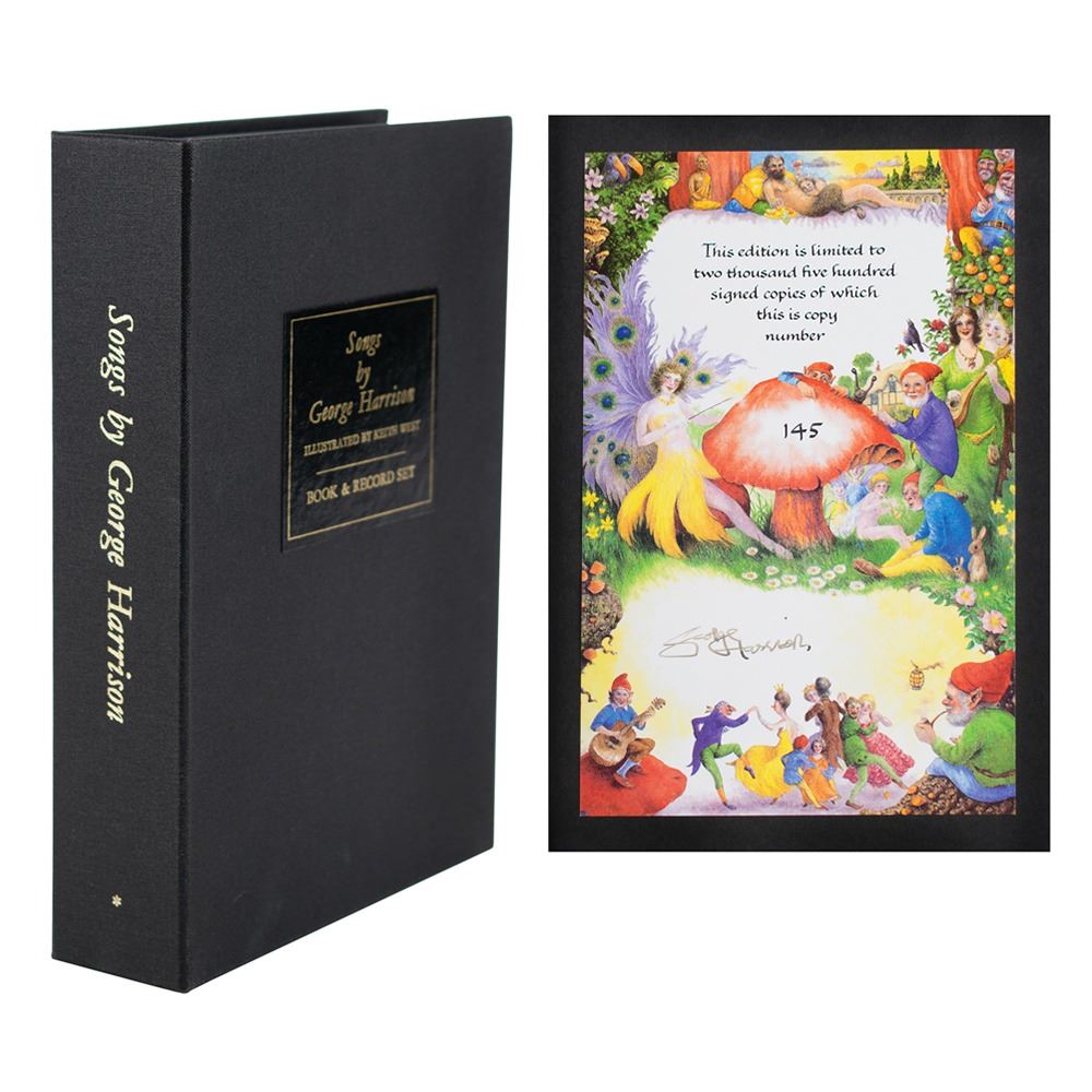 Signed book: Songs by George Harrison: Book and Record Set, Vol. 1. Limited edition, numbered 145/2500. Surrey, England: Genesis Publications Limited, 1987. Leather-bound hardcover with handmade clamshell case, 8 x 11, 175 pages. Signed on the colophon in ink by Harrison. Also signed on a bookplate affixed to the first free end page by the illustrator Keith West. Slipcase includes a limited edition four-song CD with the tracks ‘Sat Singing,’ ‘Lay His Head,’ ‘For You Blue,’ and ‘Flying Hour.’ In fine condition, with slight separation to CD sleeve. Released in a single print run, this gorgeously displayed lyric book is considered an essential addition to any Harrison or Beatles collection, and is enhanced furthermore by the inclusion of the highly sought-after Songs by George Harrison EP.