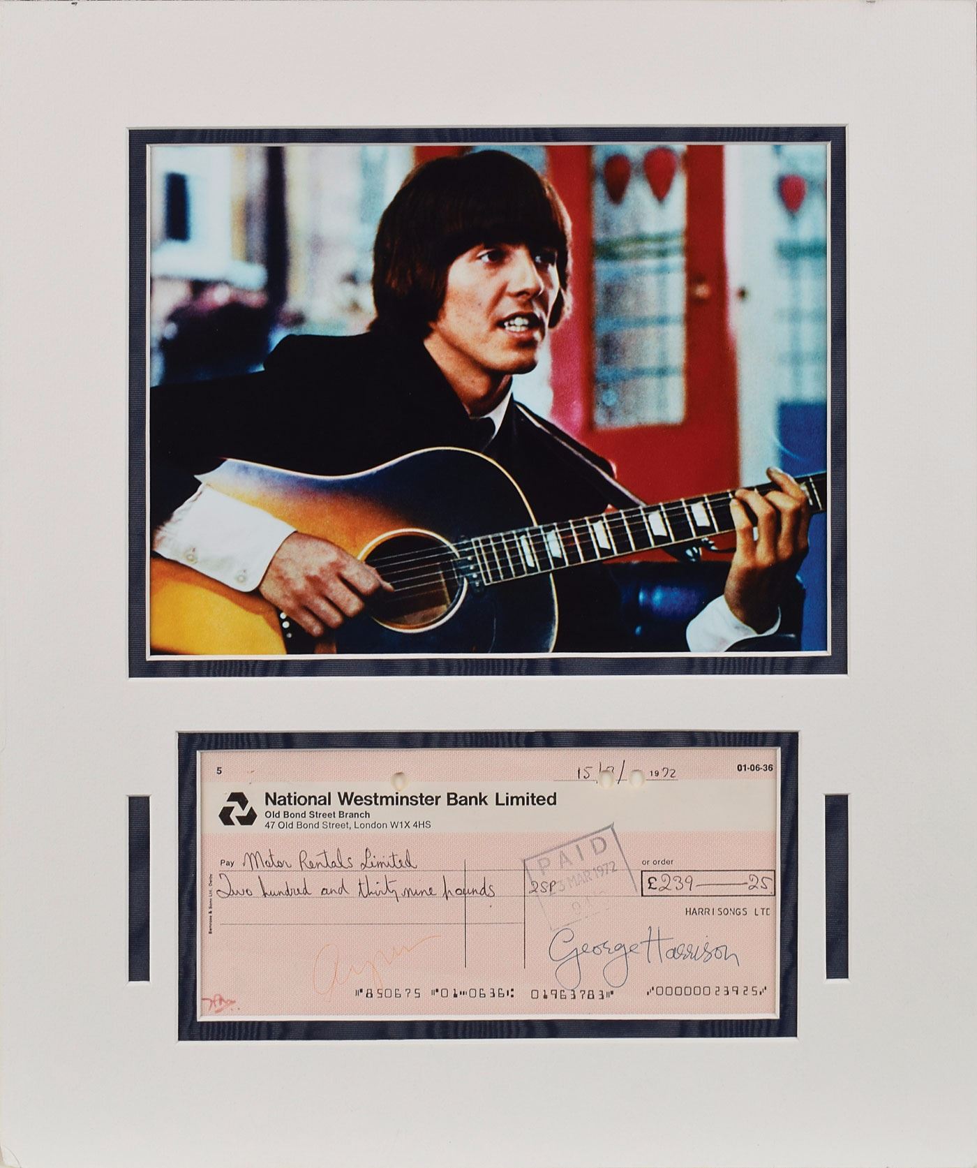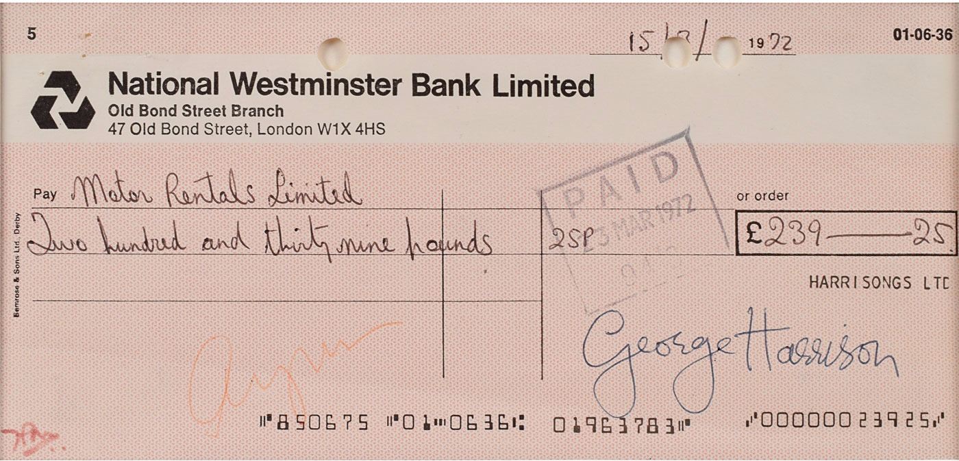 National Westminster Bank Limited check, 7.5 x 3.5, filled out in another hand and signed by Harrison, payable to Motor Rentals Limited for £239.25, March 15, 1972. Double-matted with a photo of Harrison to an overall size of 13 x 15.5. In fine condition. Unlike typical examples, Harrison's signature is unaffected by any bank stamps or notations.