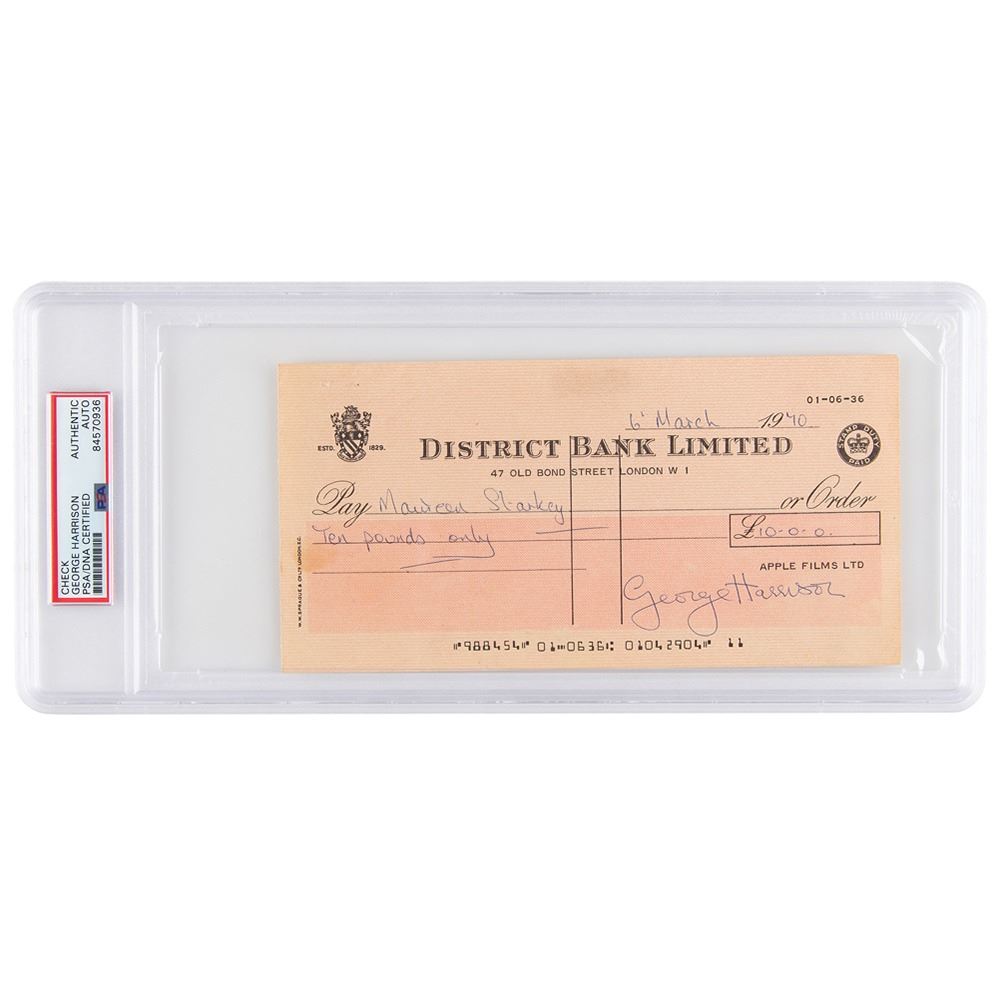 Apple Films Ltd. business check, 8 x 4, filled out in another hand and signed by Harrison, "George Harrison," payable to Ringo Starr's wife, Maureen Starkey, for £10, March 6, 1970. As the check is not stamped or endorsed, it was evidently never cashed. In fine condition, with light show-through at the top center from a small old tape stain on the back. Maureen Starkey was a hairdresser who married Beatles drummer Ringo Starr in 1965, and sang backup vocals on 'The Continuing Story of Bungalow Bill' from The White Album. She was in attendance at the famous unannounced rooftop concert, which was filmed for the Let It Be documentary—released by Apple Films in 1970. Maureen was also romantically linked to George prior to her divorce from Ringo in 1975. A fantastic, multifaceted piece linking together members of the Beatles' inner circle. Encapsulated in a PSA/DNA authentication holder.
