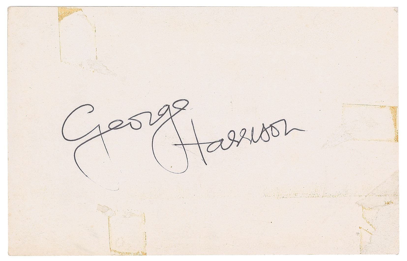 Glossy 3.5 x 5.5 close-up postcard photo of Harrison, boldly signed on the reverse in black ballpoint, "George Harrison." In very good condition, with tape stains and tape-related surface loss (all easily matted out), and heavy creasing and surface cracking to the photo side, which is far less evident on the signed side.