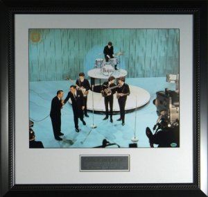 On 7 February 1964, the Beatles left the United Kingdom with an estimated 4000 fans gathered at Heathrow, waving and screaming as the aircraft took off. Upon landing at New York's John F. Kennedy Airport, an uproarious crowd estimated at 3000 greeted them. They gave their first live US television performance two days later on The Ed Sullivan Show, watched by approximately 73 million viewers in over 23 million households, or 34 per cent of the American population. Biographer Jonathan Gould writes that, according to the Nielsen rating service, it was "the largest audience that had ever been recorded for an American television program".This is a Beatles unautographed 16x20 photo from Ed Sullivan Show Appearance. Custom Framed and Matted.