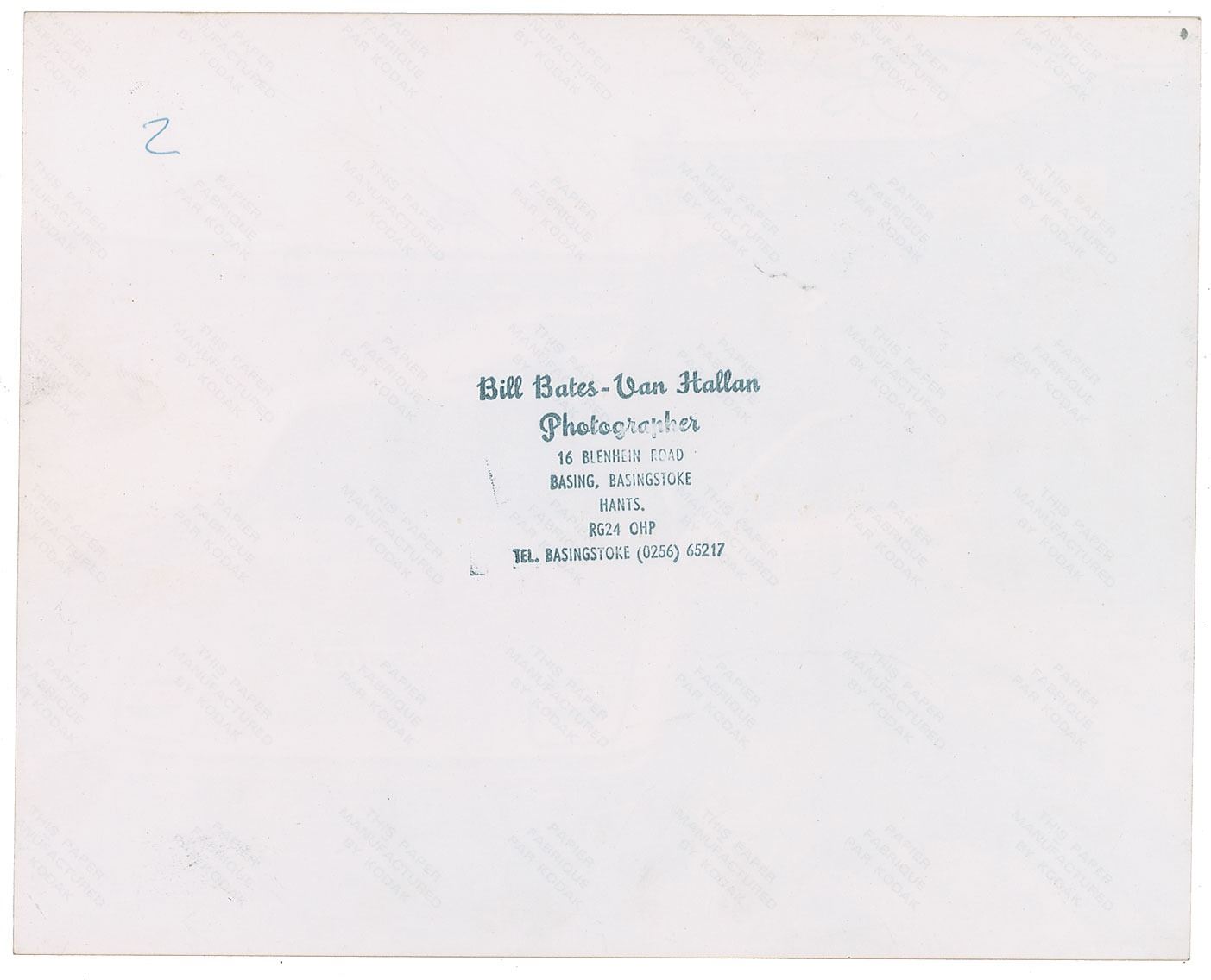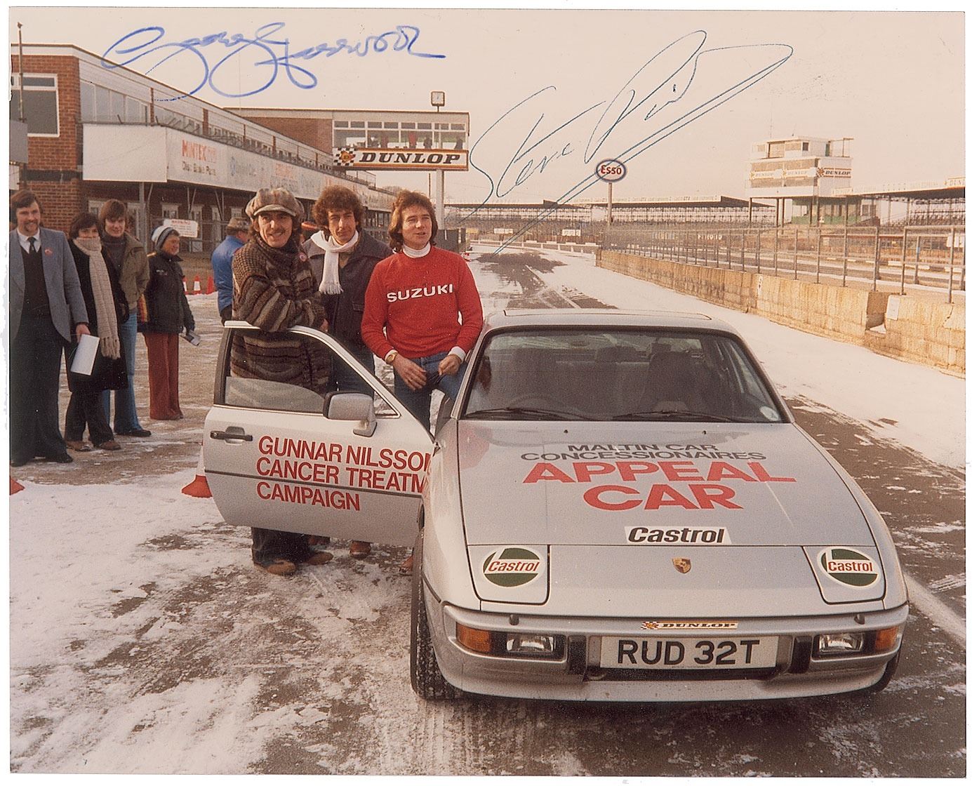 Color satin-finish 10 x 8 photo of George Harrison, DJ Dave Cash, and Barry Sheene standing next to a silver Porsche 924 taken at the Silverstone motor racing track on January 6, 1979, signed in black ink by George Harrison and Bad Company's Steve Price. George was at the track to take part in the ‘Gunnar Nilsson Endurance Drive’ in aid of the Gunnar Nilsson Cancer Treatment Campaign, which took place from January 6–13, 1979. The event was presented by Rodney Turner, the owner of a Henley based luxury car dealership, Maltins Cars, the dealership that supplied George Harrison with some of his car collection including a black Porsche 930 with the registration plate ‘YOU 5.’ The photograph was taken by motor sports photographer Bill Bates-Van Hallan and has his stamp on the reverse. In fine condition. Accompanied by a certificate of authenticity from Tracks.