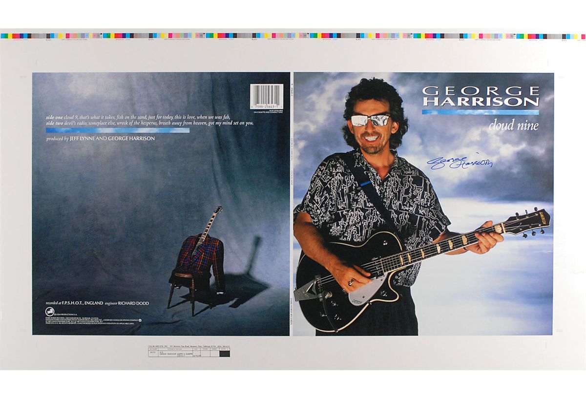 Uncommon original album cover proof for Harrison’s 1987 release Cloud Nine, 28.25 x 16.75, signed on the front cover in blue felt tip, “George Harrison.” In fine condition. Cloud Nine was a comeback album of sorts for Harrison, who had taken a five-year hiatus from recording. It was also to be his last solo album released during his lifetime.
