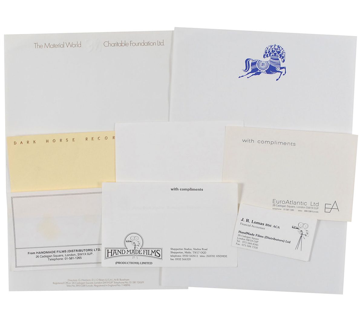 Eight different pieces of unused stationery related to Harrison and his ventures, various sizes, including Friar Park Studio, Dark Horse Records, Handmade Films, The Material World, and EuroAtlantic. In overall fine condition.