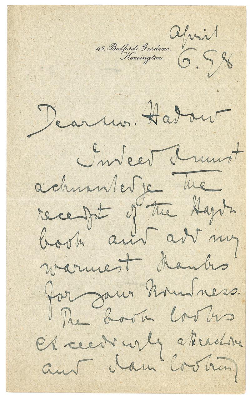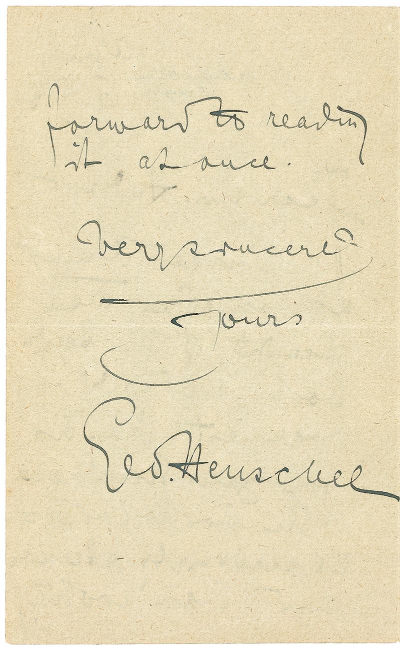 British composer; organizer and conductor of the London Symphony Orchestra. ALS signed “Geo. Henschel,” one page both sides, 4.5 x 7.25, personal letterhead, April 6, 1898. Henschel sends thanks for a book. In part: “Indeed I must acknowledge the receipt of the Haydn book and my warmest thanks for your kindness.” In fine condition, with a few light creases, and some scattered light toning. RRAuction COA.