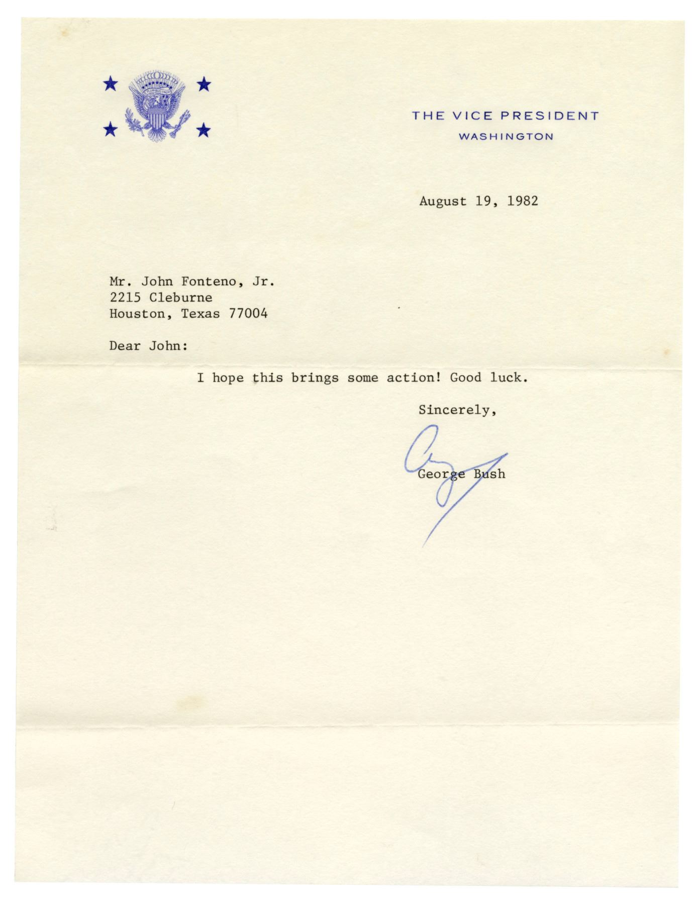 George H.W. Bush letter signed as Vice President, dated 19 August 1982. This quick letter reads, ''I hope this brings some action! Good luck.'' Letter on Vice Presidential stationery measures 7'' x 9''. Folds, otherwise near fine.