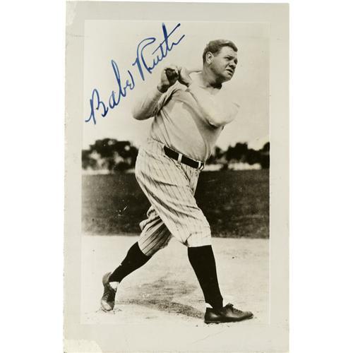 <B>George Herman "Babe" Ruth Signed Photograph. </B></I> Black and white photograph of the Babe in action; this photo shows Ruth swinging his bat and looking off into the stands. It measures 3.5" x 5.5" and is signed in bold, blue fountain pen as <I> "Babe Ruth." </B></I> Babe Ruth is considered by many to be the greatest baseball player of all time. <BR> The photograph is in very fine condition; slight soiling present on the edges. From the Henry E. Luhrs Collection. Accompanied by LOA from PSA/DNA.