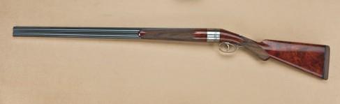 George Hoenig rotary action game gun. 28ga, 2-3/4” shells, approx. 28” barrels, blue and satin finish, select checkered walnut stocks, double triggers, auto ejectors, Pachmyer recoil pad. Measures 13-3/4” to the end of the wood, 14-1/2” to the end of the pad. Serial #25. These beautifully machined guns show George Hoenig round action where this design is quite revolutionary where the barrels slip into a collar and are simply turned to lock. The precision work is impressive and beautifully accomplished. The gun is fine to near mint showing little to no use, just slight assembly and storage. George Hoenig is considered one of the finest arms makers in America and is well recognized for this precision gun. From the Robert Petersen estate. Est: $7,000 - $14,000