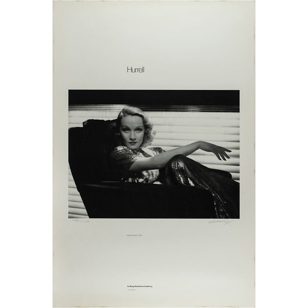 Limited edition 23 x 35 print entitled 'Marlene Dietrich, 1936,' numbered 146/250, signed in pencil by the renowned Hollywood photographer, "Hurrell." Rolled and in fine condition, with edgewear and a crease to the upper left corner tip.
