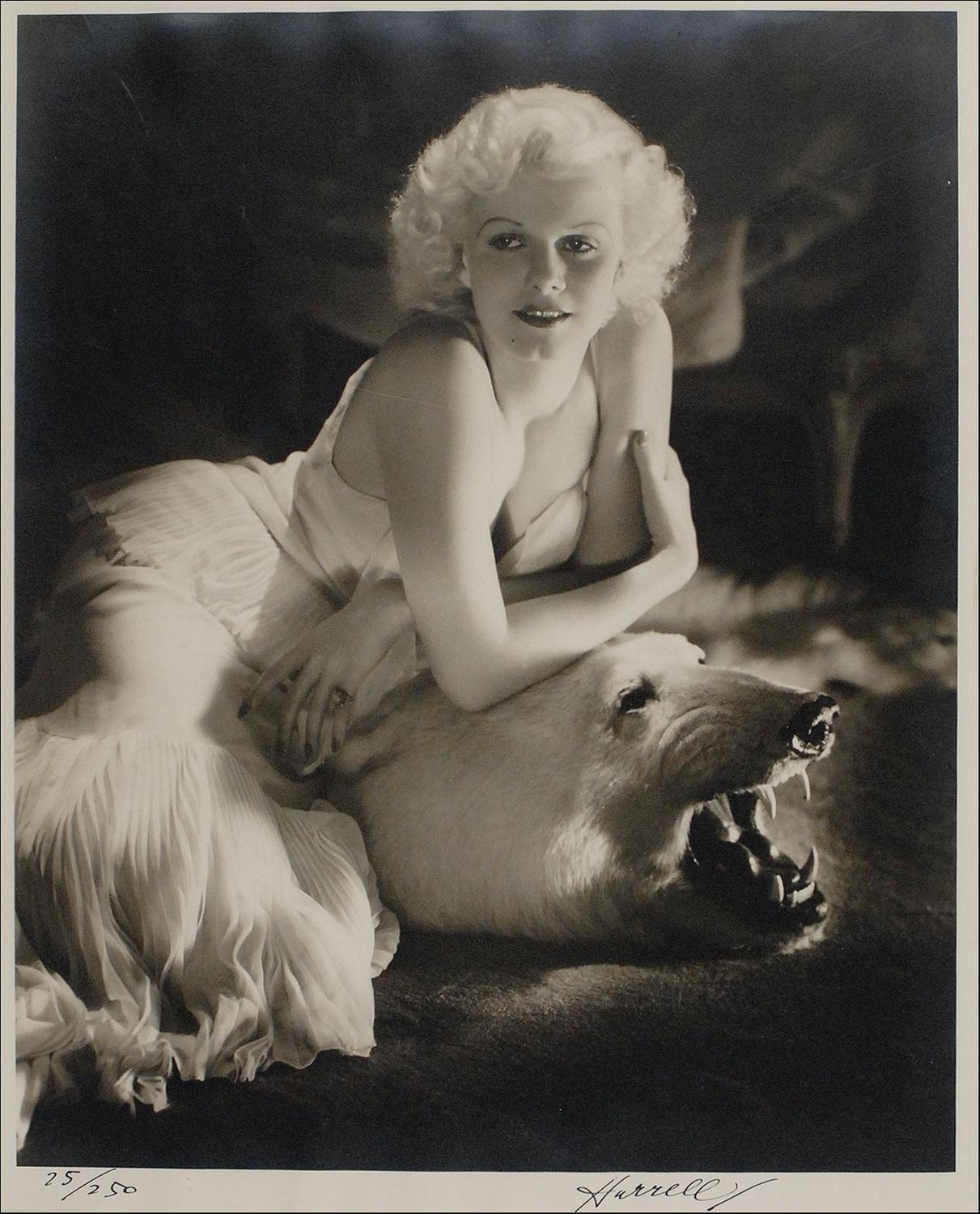 Striking oversized limited edition 16 x 20 matte-finish close-up photo of Jean Harlow on a bear rug, #25/250, signed in the lower border in black ink, “Hurrell.” In fine condition, with slight rippling, a few creases, and silvering along the dark edges. This breathtaking photo, one of the most highly demanded images of the actress, appeared in Hurrell’s ‘Portfolio I’ and was taken in a session for Vanity Fair magazine.