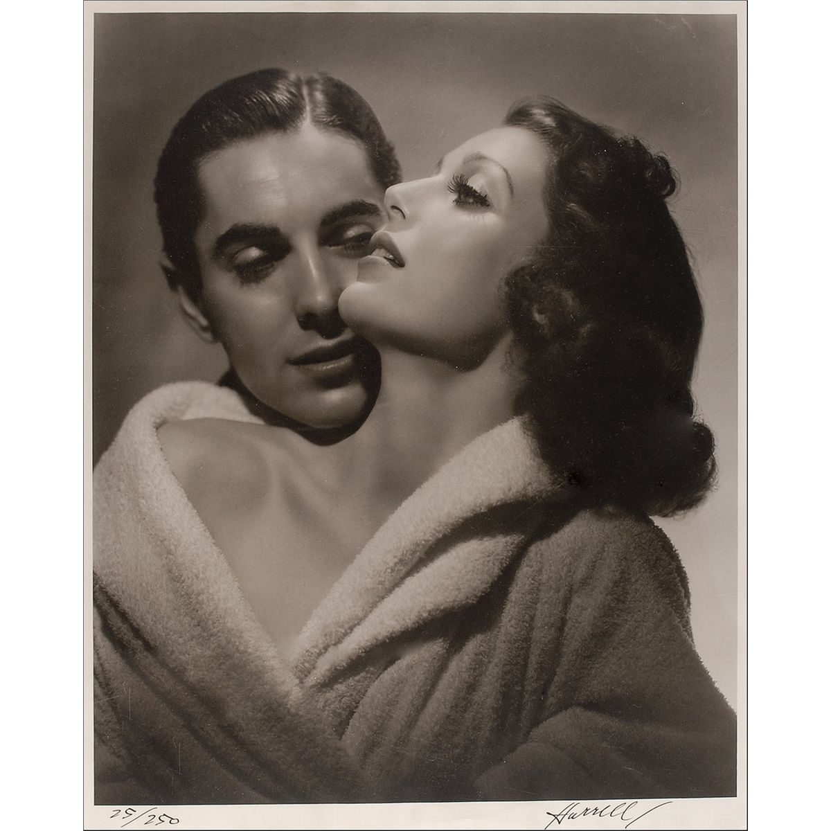Striking oversized limited edition 16 x 20 silver gelatin portrait photo of Tyrone Power and Loretta Young, #25/250, signed in the lower border in black ink, “Hurrell.” In fine condition, with a bit of scattered light silvering to darker areas and some mild rippling and small mounting remnant along top edge. This gorgeous photo, originally taken in 1937 for Love Is News, appeared in Hurrell’s ‘Portfolio I.’