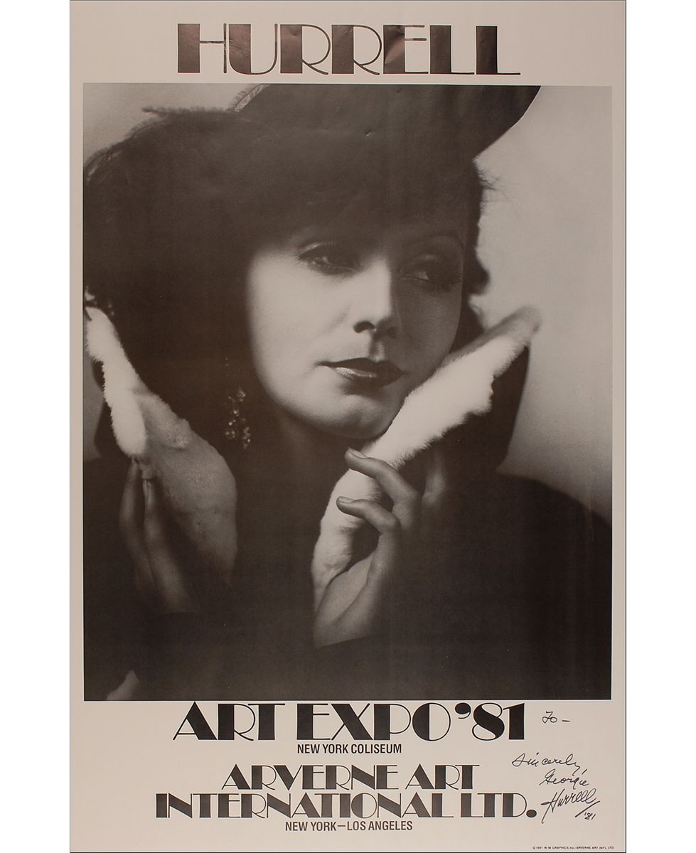 Promotional poster featuring an image of Greta Garbo, 23 x 35, for the Art Expo ‘81, New York Coliseum, signed in black felt tip, “Sincerely, George Hurrell /’81,” adding “To–,” at the top. In fine condition and suitable for framing.