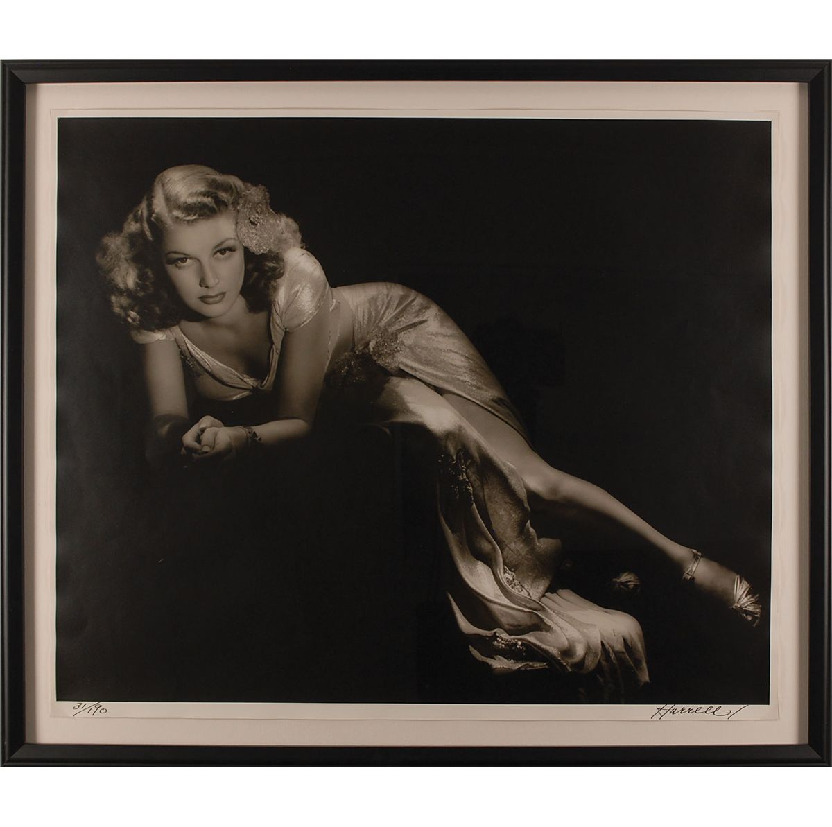 Limited edition matte-finish 24 x 20 portrait of Ann Sheridan originally taken in 1938, hand-numbered 31/190, signed in the lower right border in black ink, “Hurrell.” Tastefully corner-mounted and framed to an overall size of 27 x 23. In fine condition, with slight rippling to edges. Oversized.