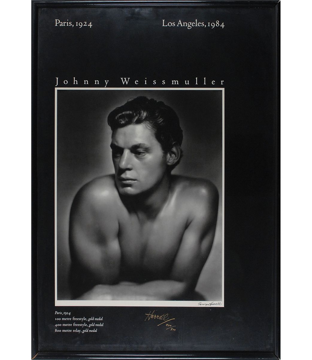 Limited edition 21.5 x 32 print of Hurrell’s portrait of Johnny Weissmuller honoring his Olympic achievements, numbered 440/500, signed in the lower border in gold ink, “Hurrell.” Framed to an overall size of 23 x 33. In fine condition. Originates from the estate of Weissmuller’s daughter, Lisa Weissmuller Gallagher. Oversized.