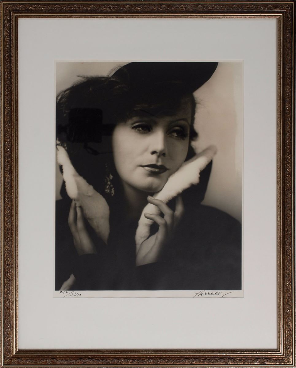 Beautiful limited edition matte-finish 15.75 x 19.75 gelatin silver photo of Greta Garbo by George Hurrell, numbered 212/250, signed in the lower border in black ink by the photographer, “Hurrell.” Matted and framed to an overall size of 24.5 x 30.5. In fine condition. Oversized.