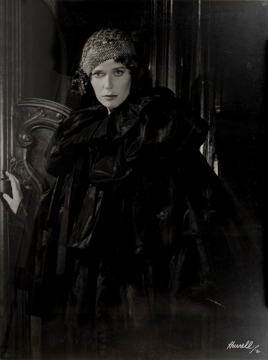 Massive 36 x 48 three-quarter length photo of the lovely French actress Sylvia Kristel, signed in the lower right in white paint, “Hurrell/‘80.” Framed under Plexiglas and in fine condition. Hurrell photos of such atypical size remain highly desirable. Oversized.