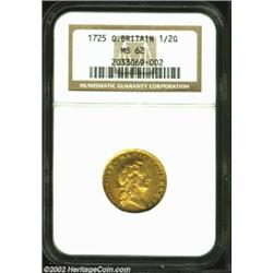 George I Gold 1/2 Guinea 1725, KM560, MS62 NGC, well defined with rose-violet accents on the reverse. First year of type. From the Hans A. Land Collection. Important notice: We expect to be auctioning lots at the rate of 200-250 per hour. Sometimes eBay Premier live bid software cannot keep up with that pace, so we strongly recommend that you place a realistic proxy bid now as insurance to avoid disappointment. Also please note that all Heritage/CAA lots purchased through eBay Premier carry a 20% Buyer's Premium. Please make sure you read the Terms and Conditions.