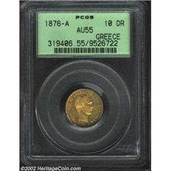 George I Gold 10 Drachmai 1876A, KM48, AU55 PCGS. Light rubbing with considerable remaining luster..