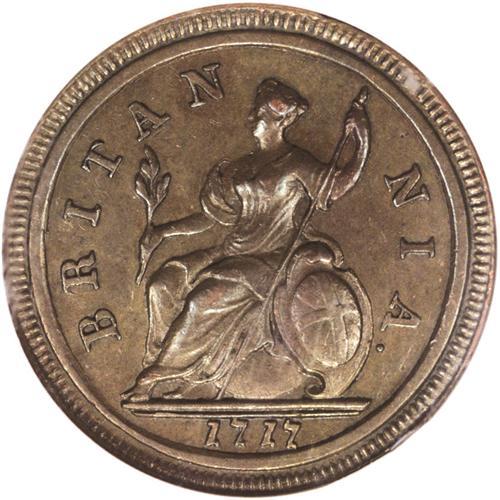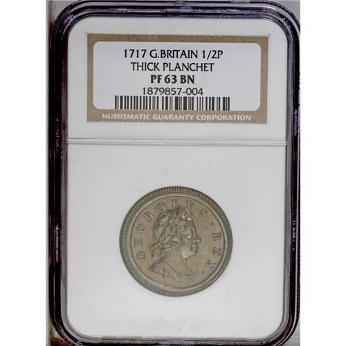 <B>George I Halfpenny 1717,</B></I> S-3659, Proof 63 Brown NGC. This is the Dump issue struck on a thick planchet. It is not a proof issue as one might normally consider a modern U.S. proof coin. A very rare coin in this exceptional condition. Struck in medal rotation.