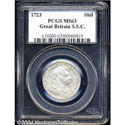 George I Shilling 1723 SSC, S-3647. Variety with a faint "S" beneath a "C" in the 3rd quarter, which many examples show. MS63 PCGS. Sharp strike with none of the often-seen mushiness near the date from grease having been on the dies. Normal small haymarks. A choice coin.From the Craig Haller Collection. Important notice: Heritage usually auctions material at the rate of 200-250 lots per hour. On some occasions eBay Live bid software or the Internet may not be able to keep up with the pace of the auction. We recommend placing a realistic absentee bid now as insurance to avoid disappointment. Occasionally the auctioneer may eliminate or reject an eBay Live bid, and the auctioneer may also reopen a lot after the close of the eBay live bidding (usually because we missed an audience bid), and may reject your bid even if it shows you as the winning bidder. By bidding via eBay Live, you agree that Heritage may award the lot to another bidder at its sole discretion under the circumstances described above or any other reasonable circumstances. Also please note that all Heritage lots purchased through eBay Live carry a 20% Buyer's Premium. Please make sure you read the Terms and Conditions before you bid.