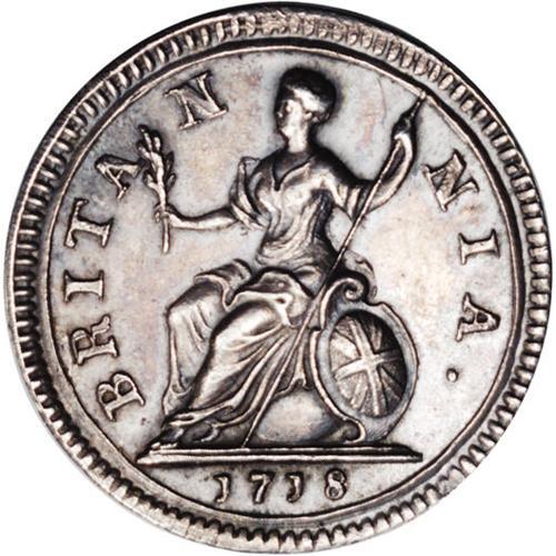 <B>George I pattern farthing in silver, 1718. </B></I>P-790 (rare). Thin flan. Prototype for the accepted design. Classic Proof edge. Attractive, "Good EF" in English parlance, a Proof with slight cabinet friction but no scratches or any problems really. Just very pleasing. Light lilac gray color. If you want a nice representation of this series type, here is a piece with super sharpness and excellent eye-appeal.