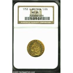 George II Gold 1/2 Guinea 1753, KM587, MS64 NGC, a dazzling example of the old laureate head type. B