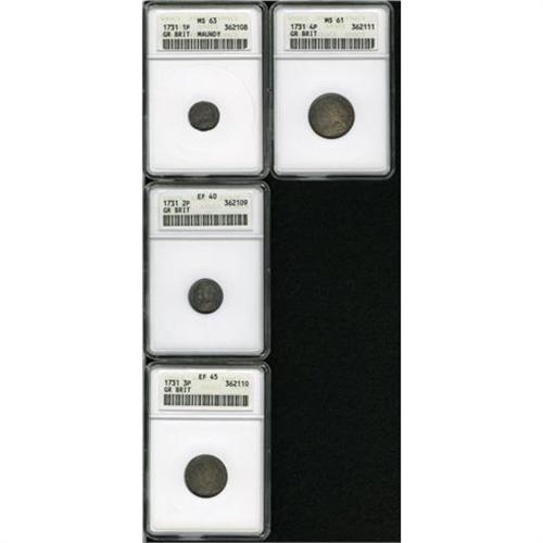 <B>George II Maundy set, 1731. </B></I>S-3716. Consists of the usual four pieces as follows: 1d MS63, 2d XF40, 3d XF45, and 4d MS61 all ANACS. Obviously an assembled set (almost all are, from before the early 19th century). All, however, have a similar mauve and bright blue toning, the 1d in particular having bright iridescence and a super-sharp strike. Very desirable and rare.
